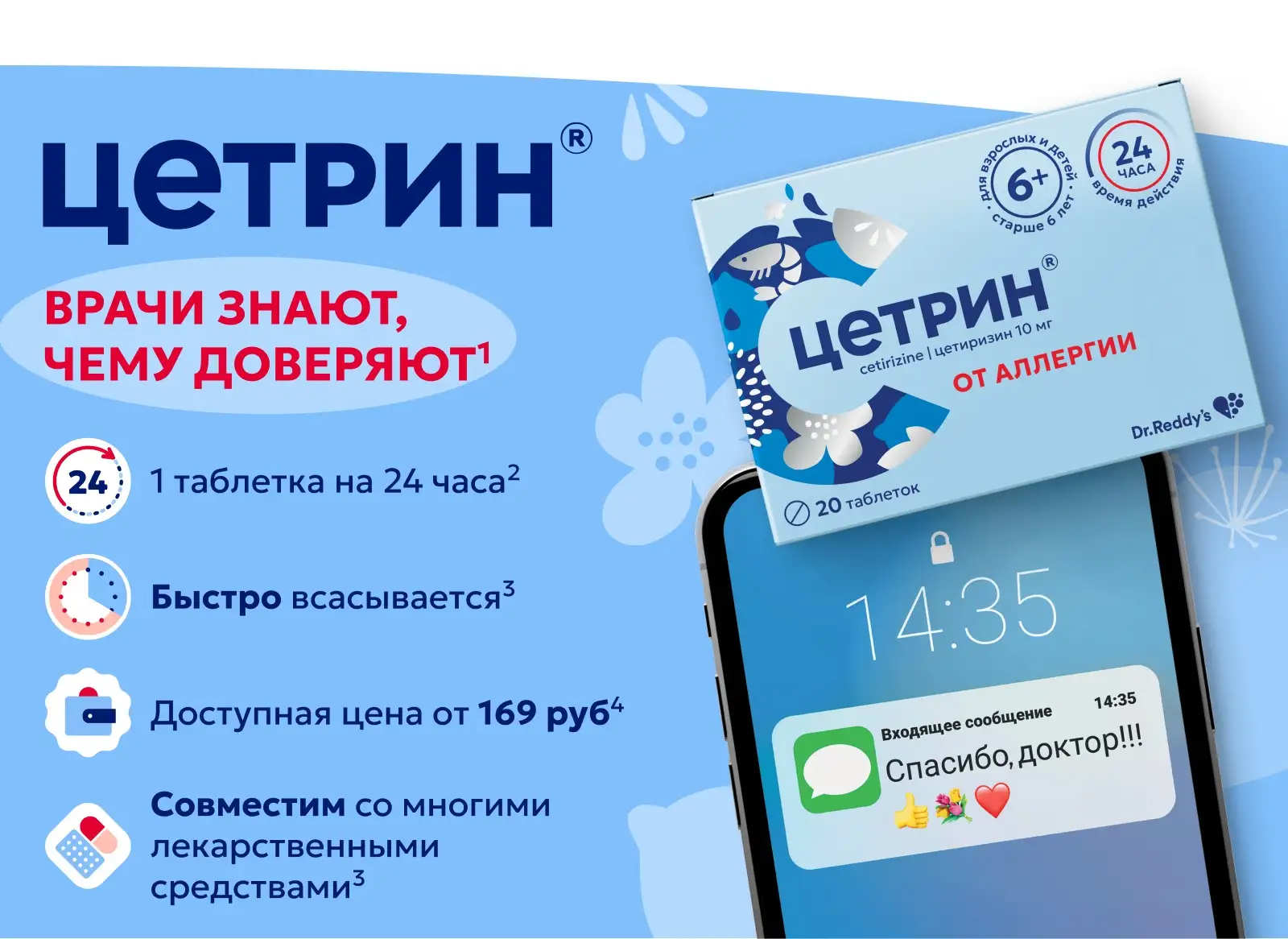 1. Лекарственный препарат Цетрин® является препаратом №1 по выписке среди врачей в группе антигистаминных препаратов (таблетки), согласно данным Prindex ("Приндекс") за 1 квартал 2025 года.