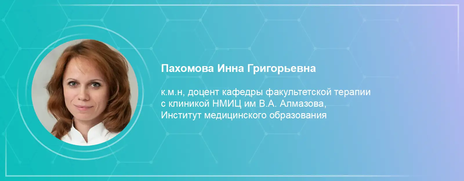 Пахомова Инна Григорьевна, к.м.н., доцент кафедры факультетской терапии с клиникой НМИЦ им В.А. Алмазова, Институт медицинского образования