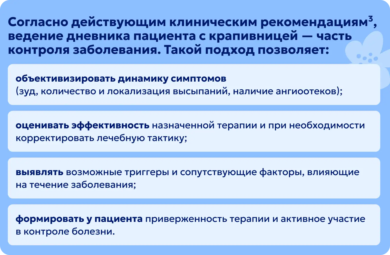 В качестве практического инструмента предлагаем пример дневника пациента с крапивницей, который может использоваться как в амбулаторной, так и в клинической практике.