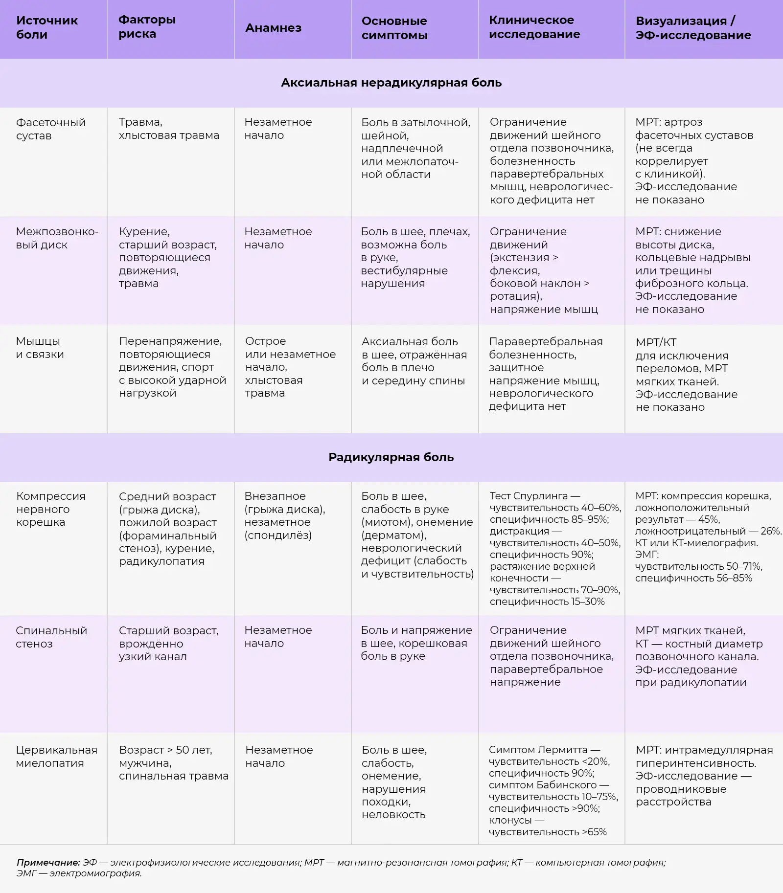 В большинстве случаев боль в шее имеет неспецифический характер [4]. Поэтому целесообразно использовать фенотипический подход, который позволяет врачу быстро определить вероятный источник боли, оценить неврологический статус и избежать избыточных диагностических процедур.