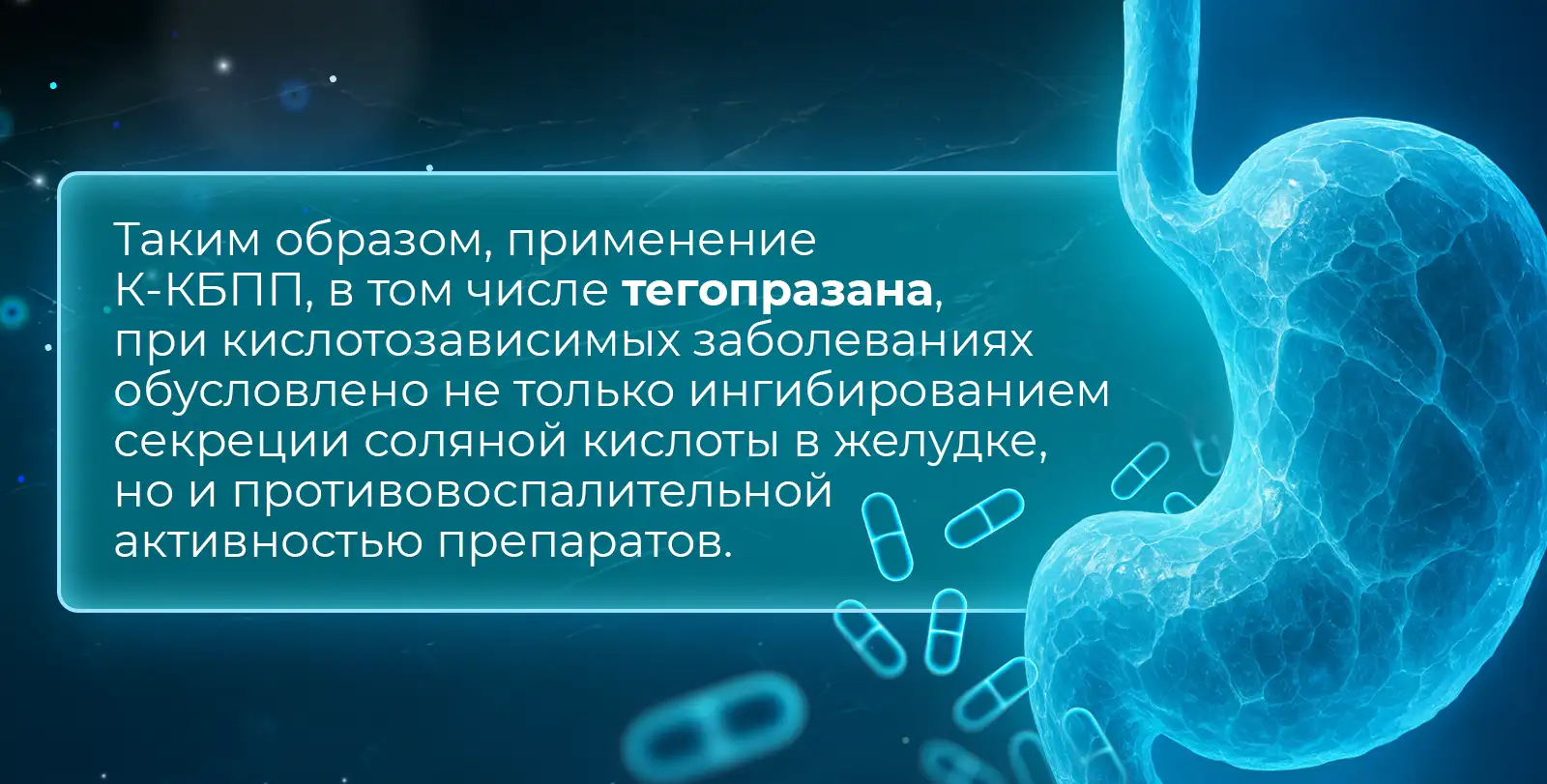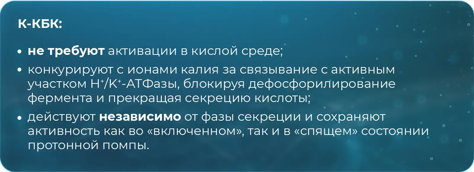 К-КБК реализуют антисекреторное действие за счет прямого и обратимого ингибирования H⁺/K⁺-АТФазы — фермента, транспортирующего ионы водорода в просвет желудка в обмен на ионы калия [2]. Это ключевой этап в процессе выработки соляной кислоты.
