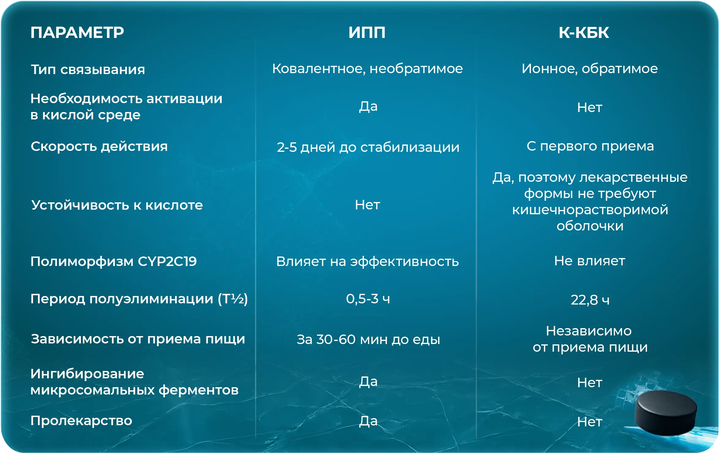 Сравнение механизмов действия, фармакокинетики и клинических эффектов позволяет выделить преимущества К-КБК [2]-[5]: