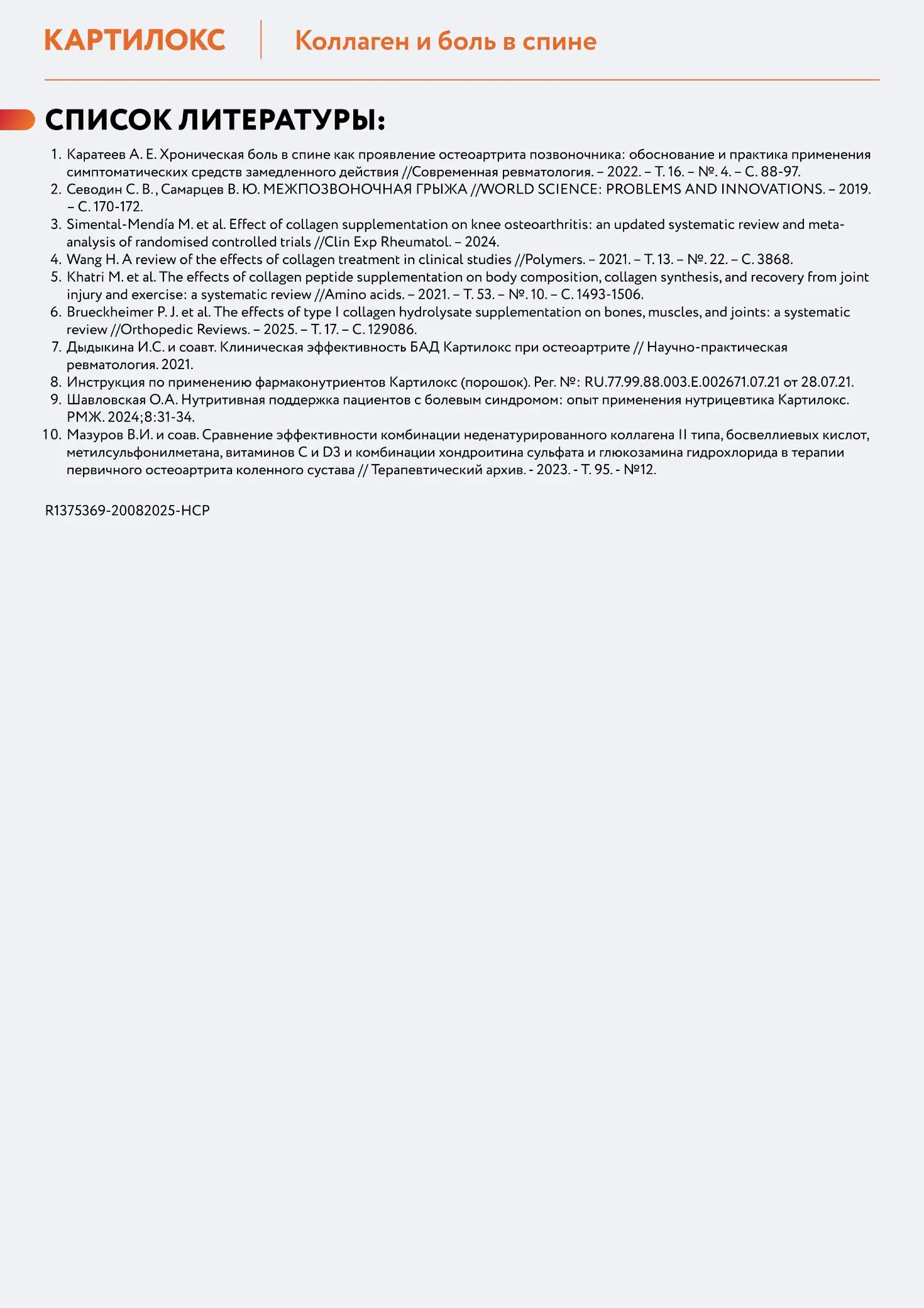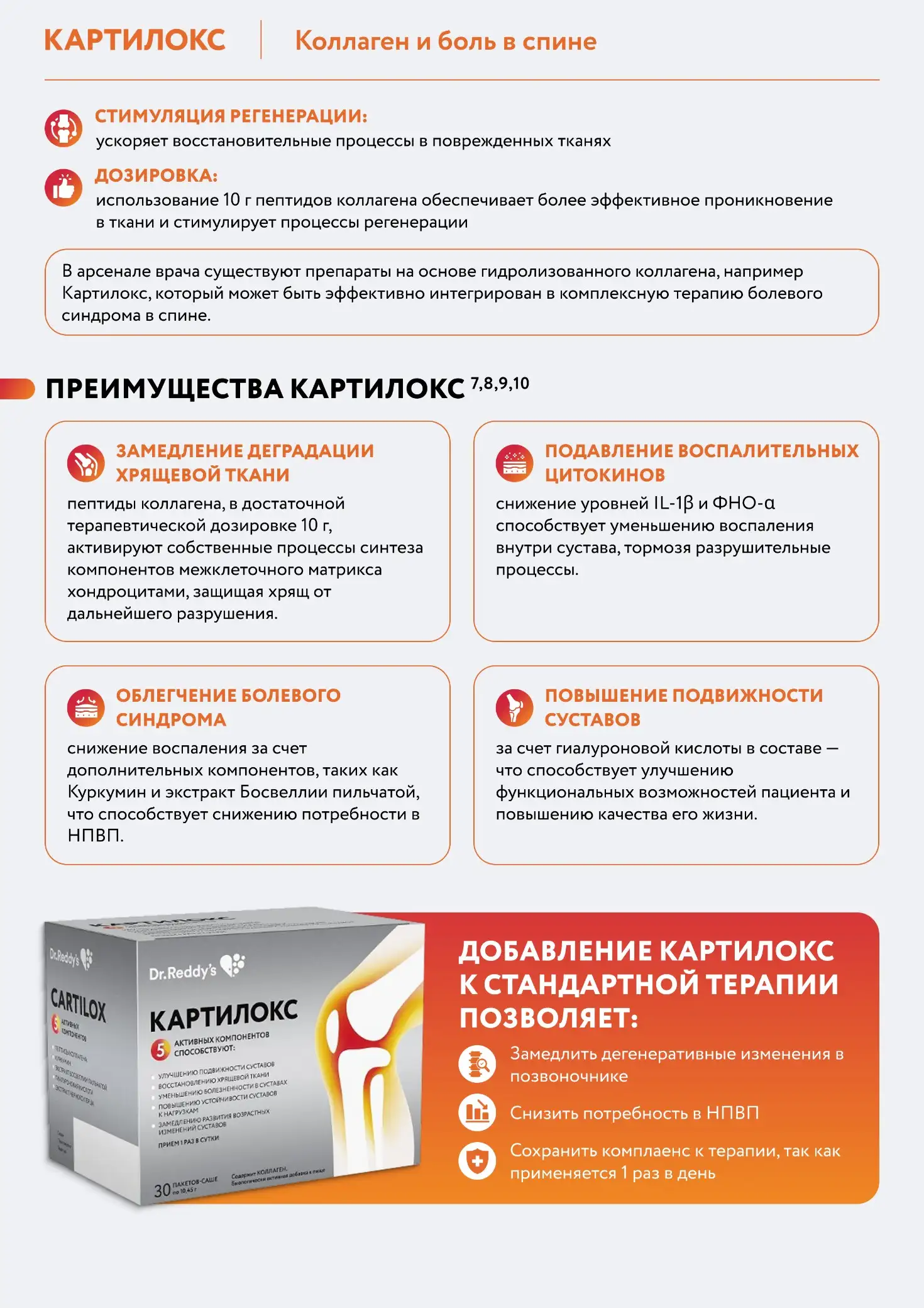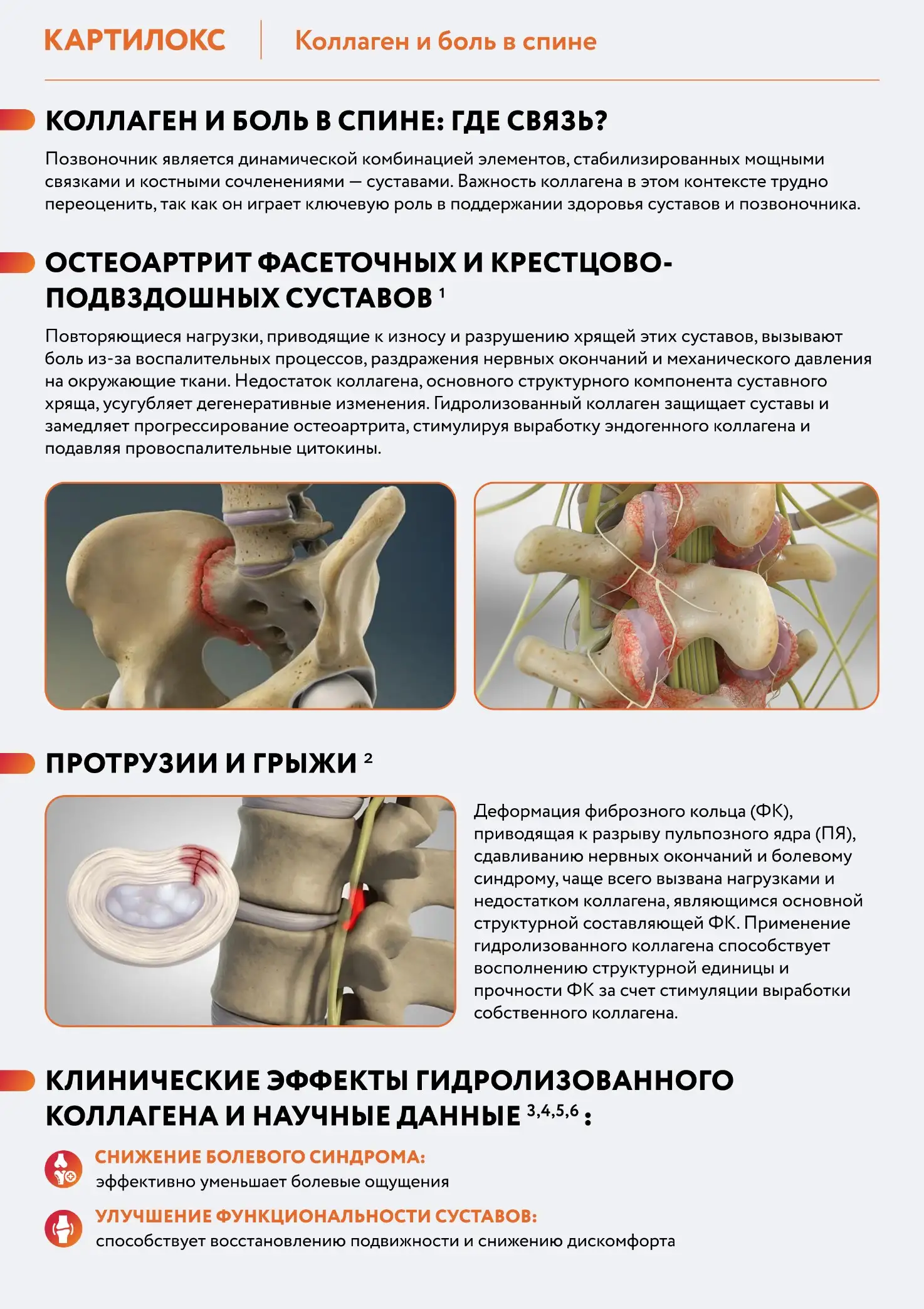 Представляем памятку «Коллаген и боль в спине» — практическое руководство, раскрывающее роль коллагена в здоровье позвоночника и эффективность гидролизованного коллагена в терапии спинальных заболеваний. Памятка поможет терапевтам и неврологам улучшить лечение боли и эффективно применять современные средства, такие как Картилокс, для повышения качества жизни пациентов.