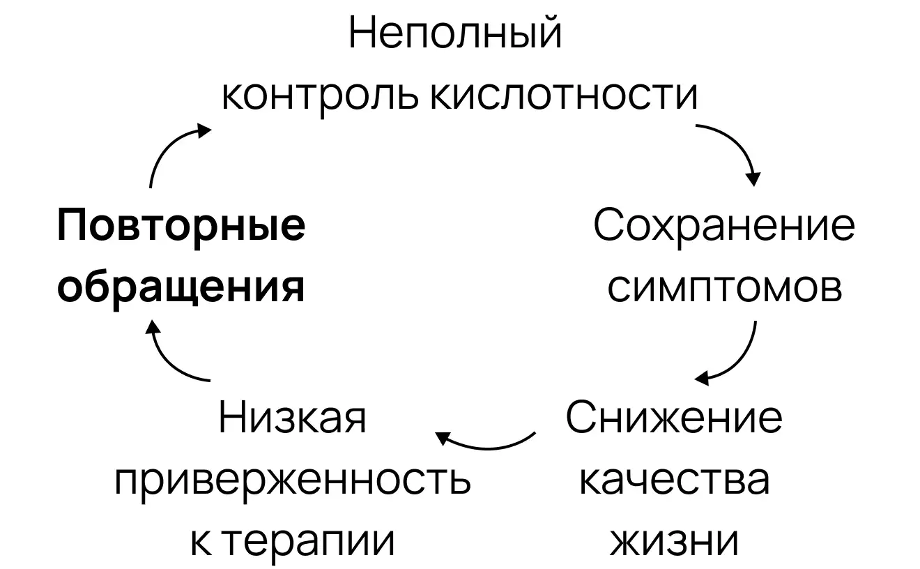 Согласно последним исследованиям, ИПП не обеспечивают быстрого и стабильного контроля кислотности — особенно в ночные часы [1],[2]. Пациенты продолжают жаловаться на ночную изжогу и «кислотные прорывы». Это вынуждает корректировать схему лечения. Почему так происходит?