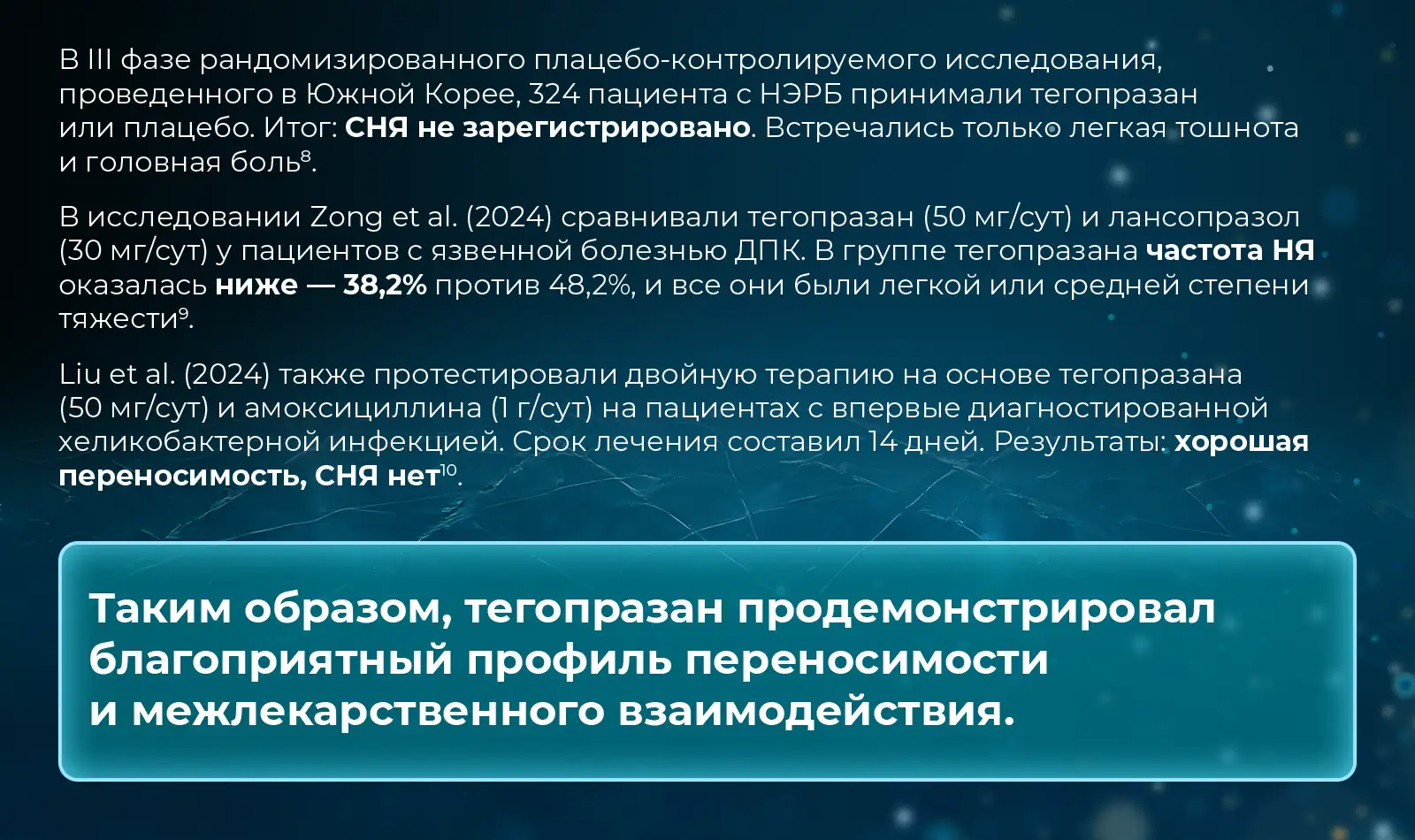 8. Kim S.H., Cho K.B., Chun H.J., Lee S.W., Kwon J.G., Lee D.H., et al. Randomized clinical trial: comparison of tegoprazan and placebo in non-erosive reflux disease. Aliment Pharmacol Ther. 2021 Aug;54(4):402–11.