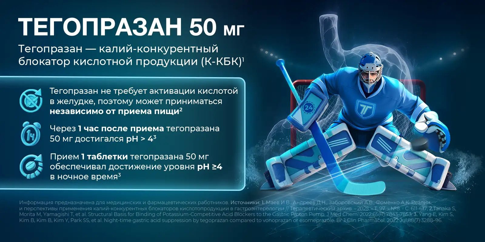 ИПП на протяжении десятилетий служат основой лечения кислотозависимых заболеваний желудочно-кишечного тракта. Однако медленное начало действия, вариабельность эффекта из-за полиморфизма CYP2C19 и неполное подавление кислотности в ночные часы побудили искать альтернативы. Одной из них стал тегопразан — представитель калий-конкурентных блокаторов кислотной продукции (К-КБК) [1].