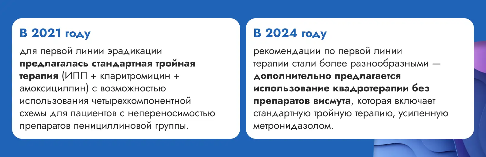 В 2024 году в качестве меры повышения эффективности антигеликобактерного лечения предложено назначение калий-конкурентных ингибиторов протонной помпы.