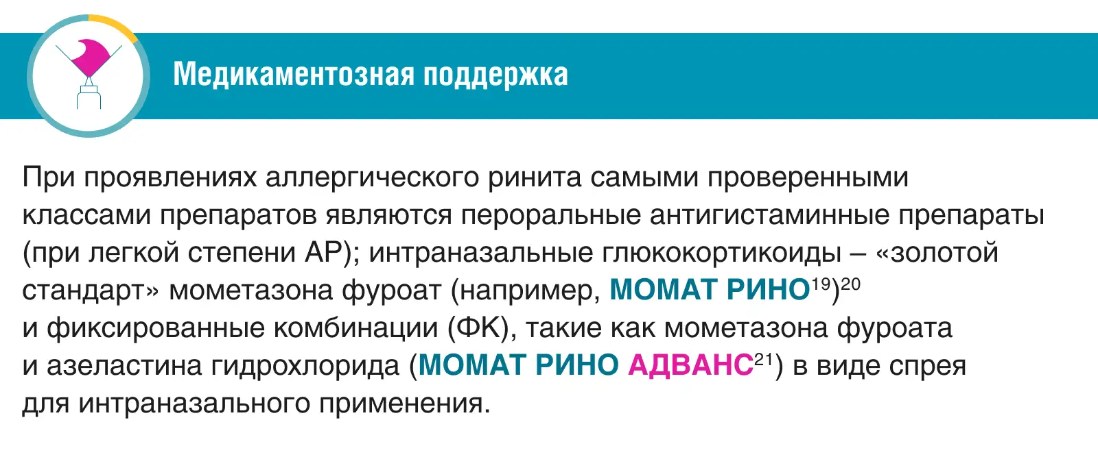 Момат Рино Адванс демонстрирует синергетический эффект в облегчении симптомов как ранней, так и поздней фазы аллергической реакции при АР, ингибируя синтез и высвобождение медиаторов, участвующих в обеих стадиях аллергического ответа, а также обладает противовоспалительным эффектом [21]. Для фиксированной комбинации продемонстрировано превосходство над монотерапией каждым из компонентов в отношении скорости наступления эффекта (уже в первые 15-30 мин) и общей эффективности в отношении снижения TNSS (общая шкала назальных симптомов) [21-23].