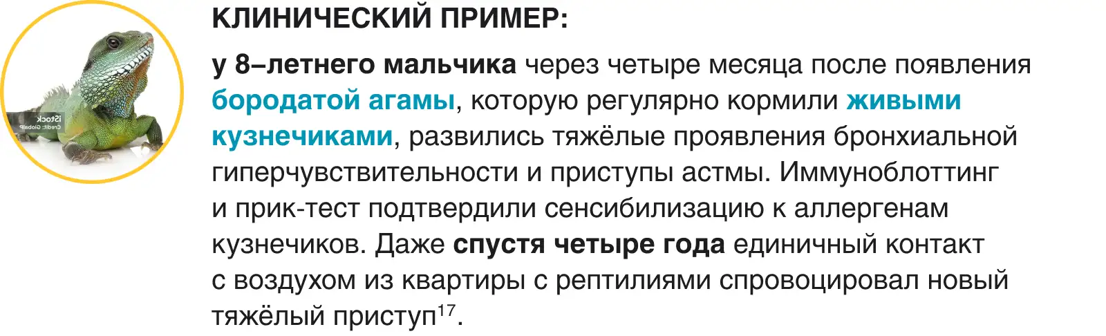 Сами рептилии редко вызывают IgE-опосредованную аллергию, но главная проблема — корм: сверчки, саранча, кузнечики, тараканы — сильные ингаляционные аллергены [17].