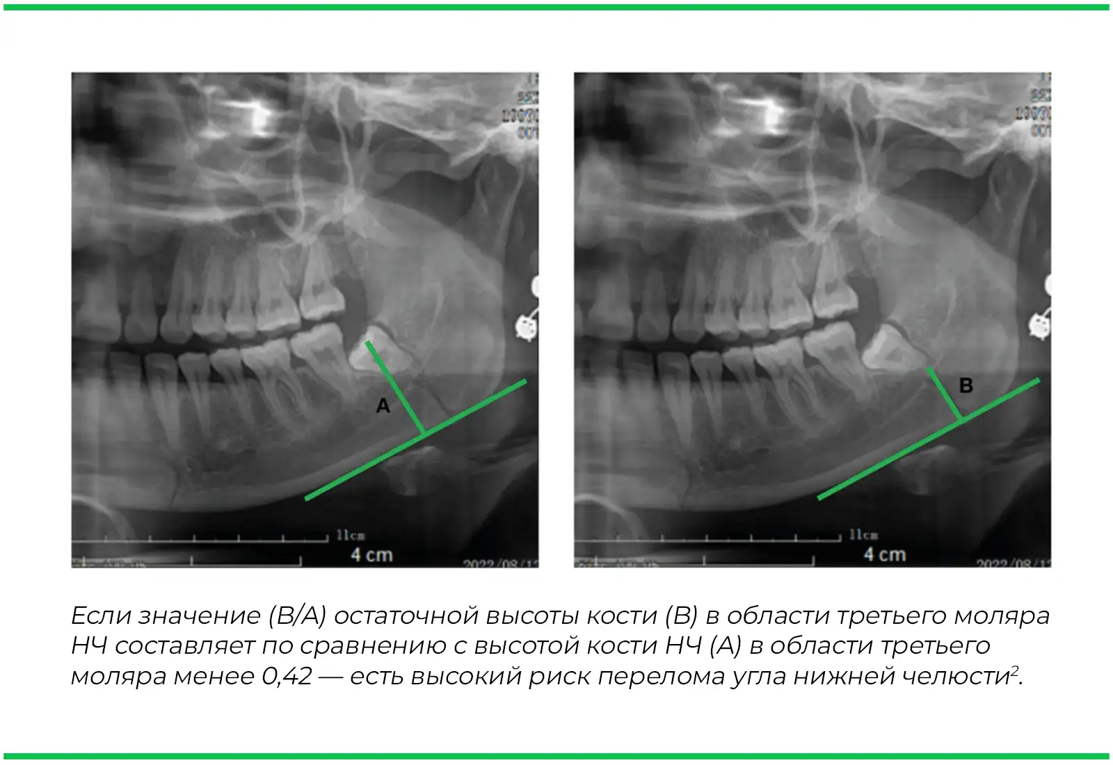 • соотношение остаточной высоты кости в области третьего моляра и высотой кости в области третьего моляра составляет менее 0,4
