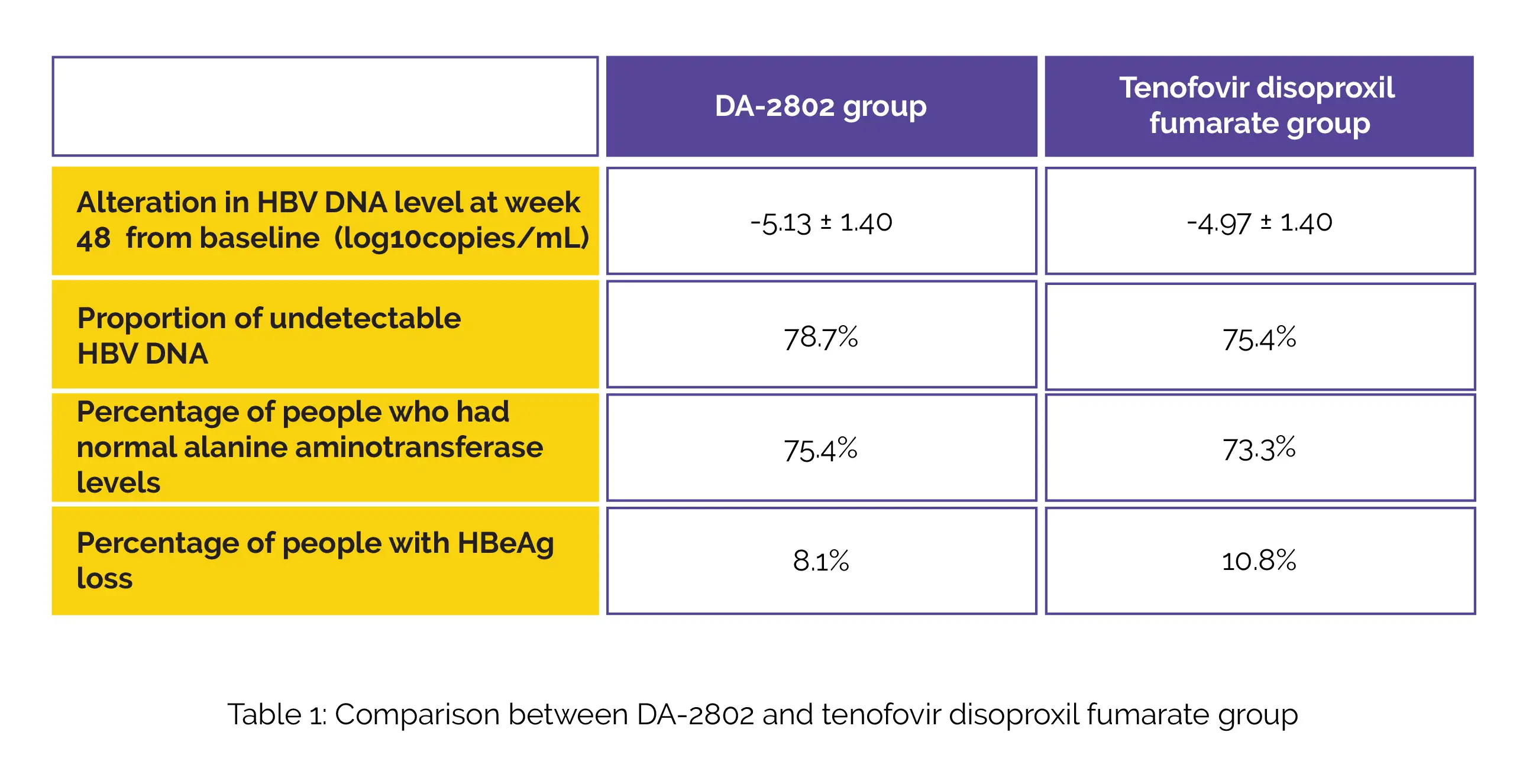 In this double-blind clinical study, 123 subjects were randomly segregated to get tenofovir disoproxil fumarate at a dose of 300 mg once daily (n=61) or DA-2802 at a dose of 319 mg once daily (n=62) for 48 weeks. The major efficacy outcome was alteration in hepatitis B virus (HBV) DNA level at week 48 following dosing in comparison with baseline.