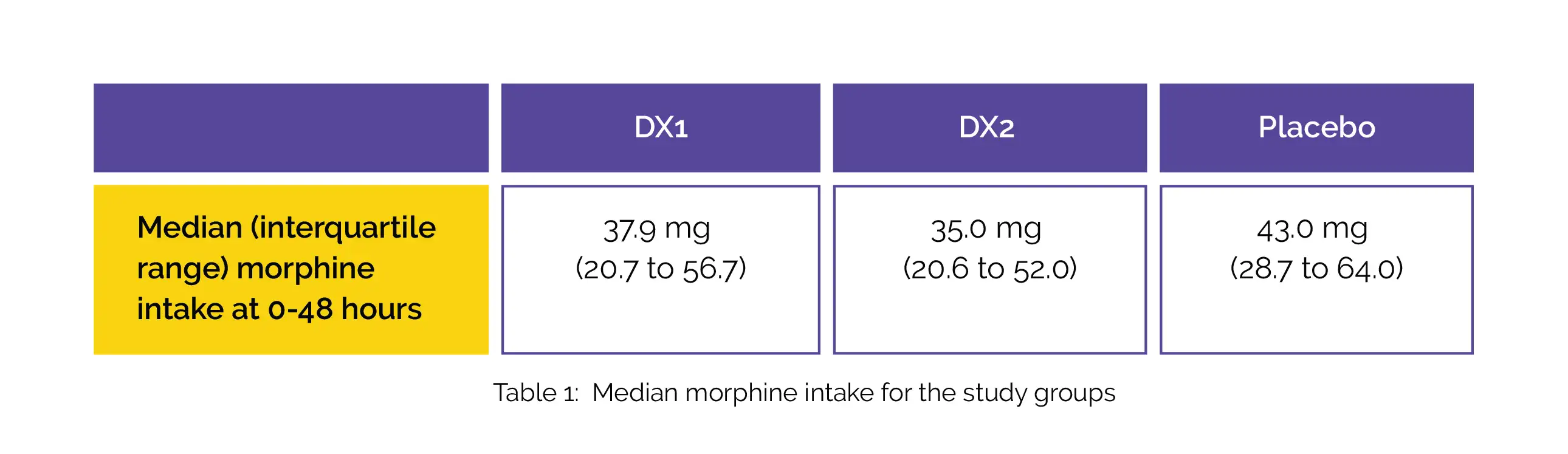 In the primary outcome assessment, data from 472 people (97.3%) were incorporated. Table 1 shows median (interquartile range) morphine intake at 0-48 hours.