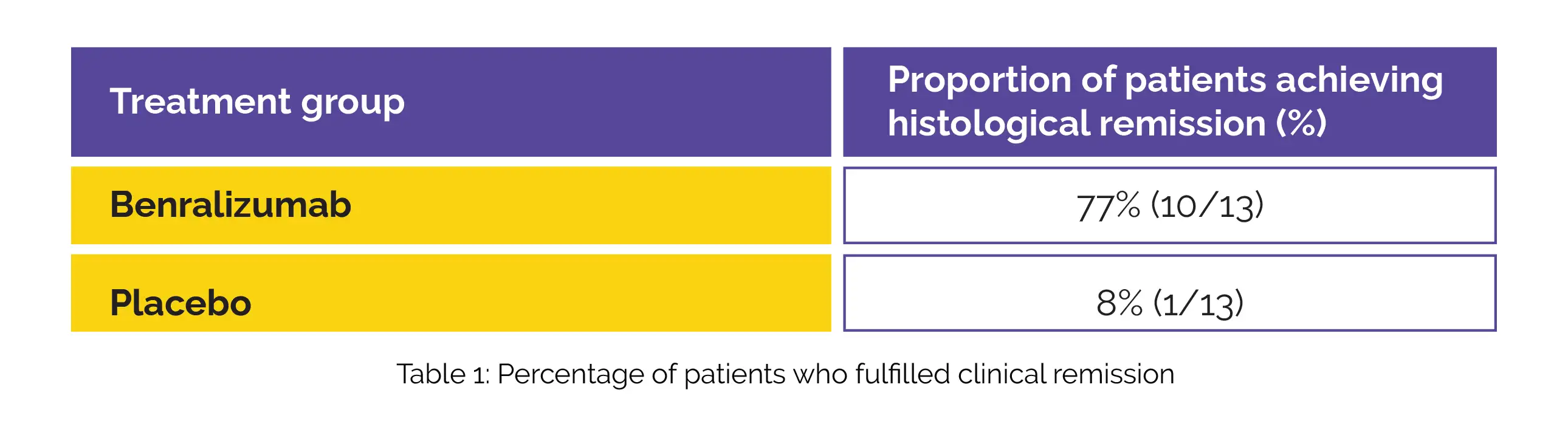 Patients met the criteria for enrollment in two open-label extension (OLE) phases, extending until week 88. During these phases, all patients were administered Benralizumab subsequent to the initial 12-week double-blind period. Thirty-four patients were screened. Twenty-six patients were randomly assigned to either Benralizumab or placebo group (13 patients in each group). The details of histological remission have been portrayed in Table 1: