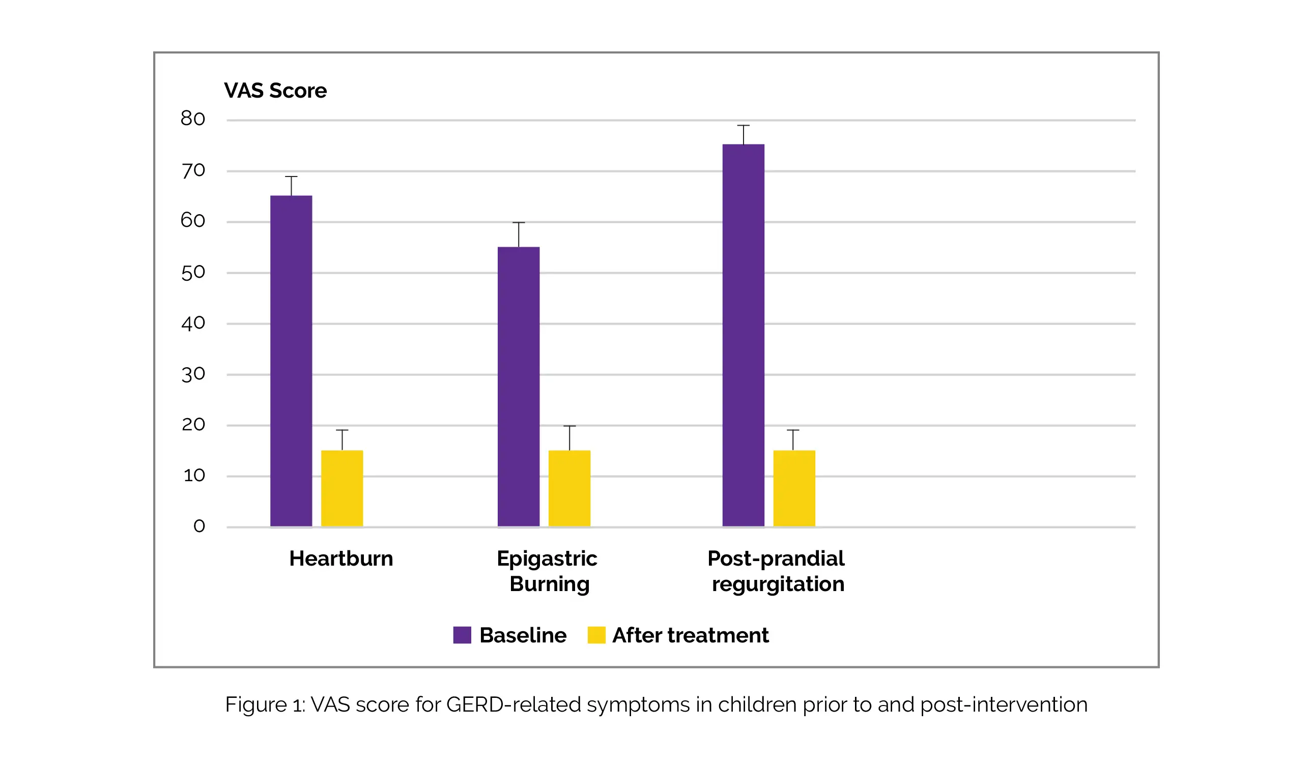Using a pain visual analog scale (VAS) scale, post-prandial regurgitation, epigastric burning, and heartburn were all assessed. Without any negative side effects and with good compliance and tolerance, all patients completed the treatment. Following therapy, all three of the key symptoms considerably improved, as seen in Figure 1: