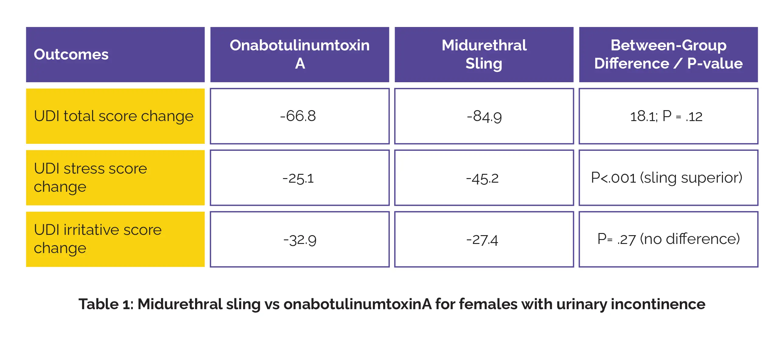 Both groups were allowed to cross over or receive additional treatment between 6 and 12 months if symptoms persisted. In total, 137 women, with an average age of 59 years, completed follow-up assessments. At 6 months, both treatments led to remarkable improvements in total Urogenital Distress Inventory (UDI) scores, a validated measure of incontinence-related bother (scale 0–300). The difference of 18.1 points between groups did not reach statistical significance. Sling surgery exhibited greater improvement in stress incontinence symptoms when compared with Botox. Improvements in urgency-related symptoms were similar between groups (Table 1).