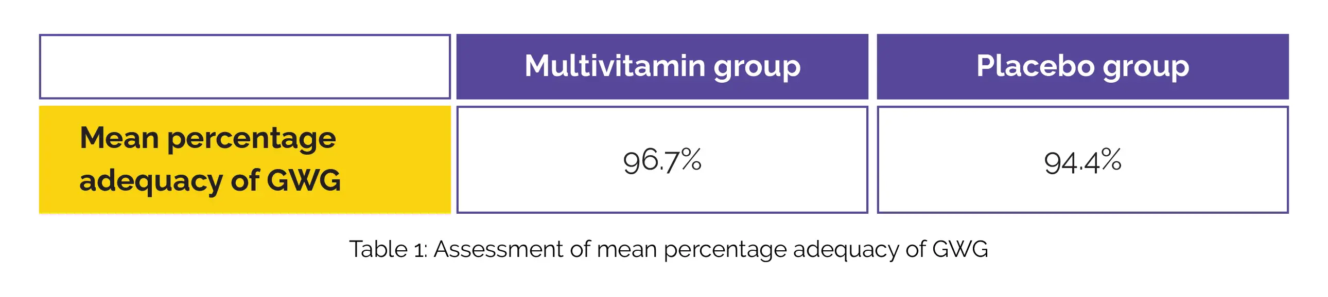 Furthermore, binary outcomes were assessed using log-binomial models. Results from the study demonstrated that pregnant women who received multivitamin supplementation exhibited improved GWG outcomes compared to those who received a placebo, as illustrated in Table 1: