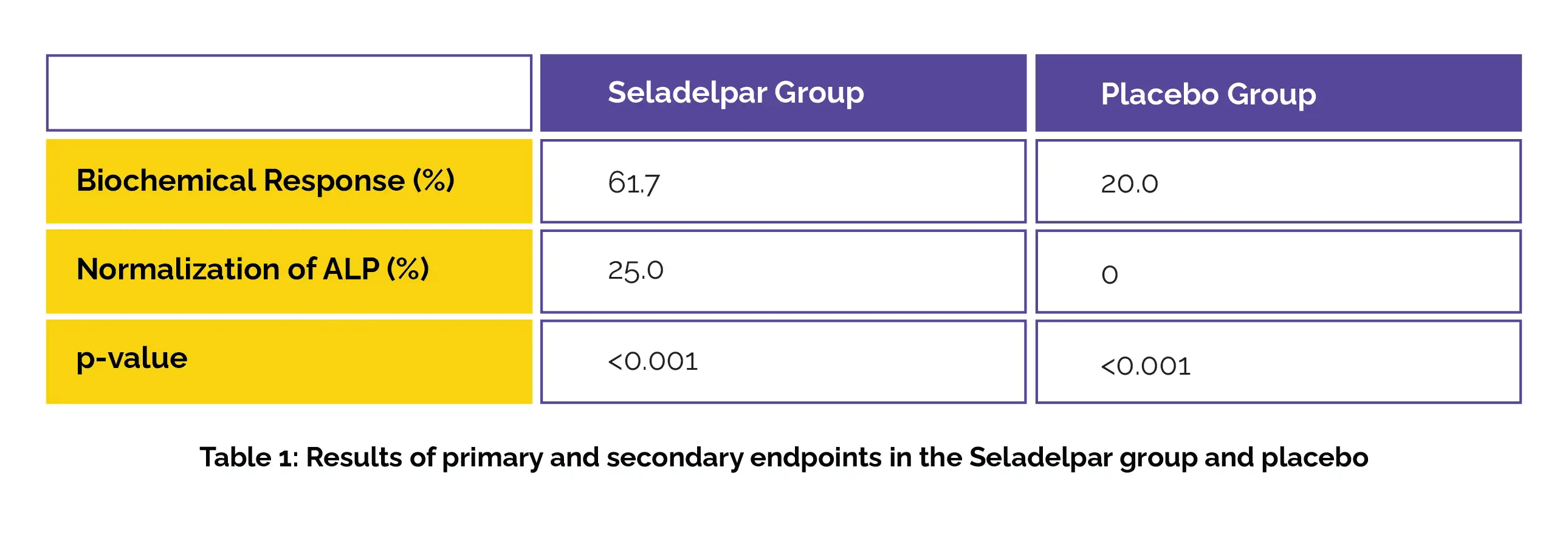 Of the total patients, 93.8% received Ursodiol as standard background therapy. Compared to the placebo group, more patients in the Seladelpar group encountered a biochemical response. Normalization of ALP levels was also more common in the Seladelpar group (P<0.001) as shown in Table 1: