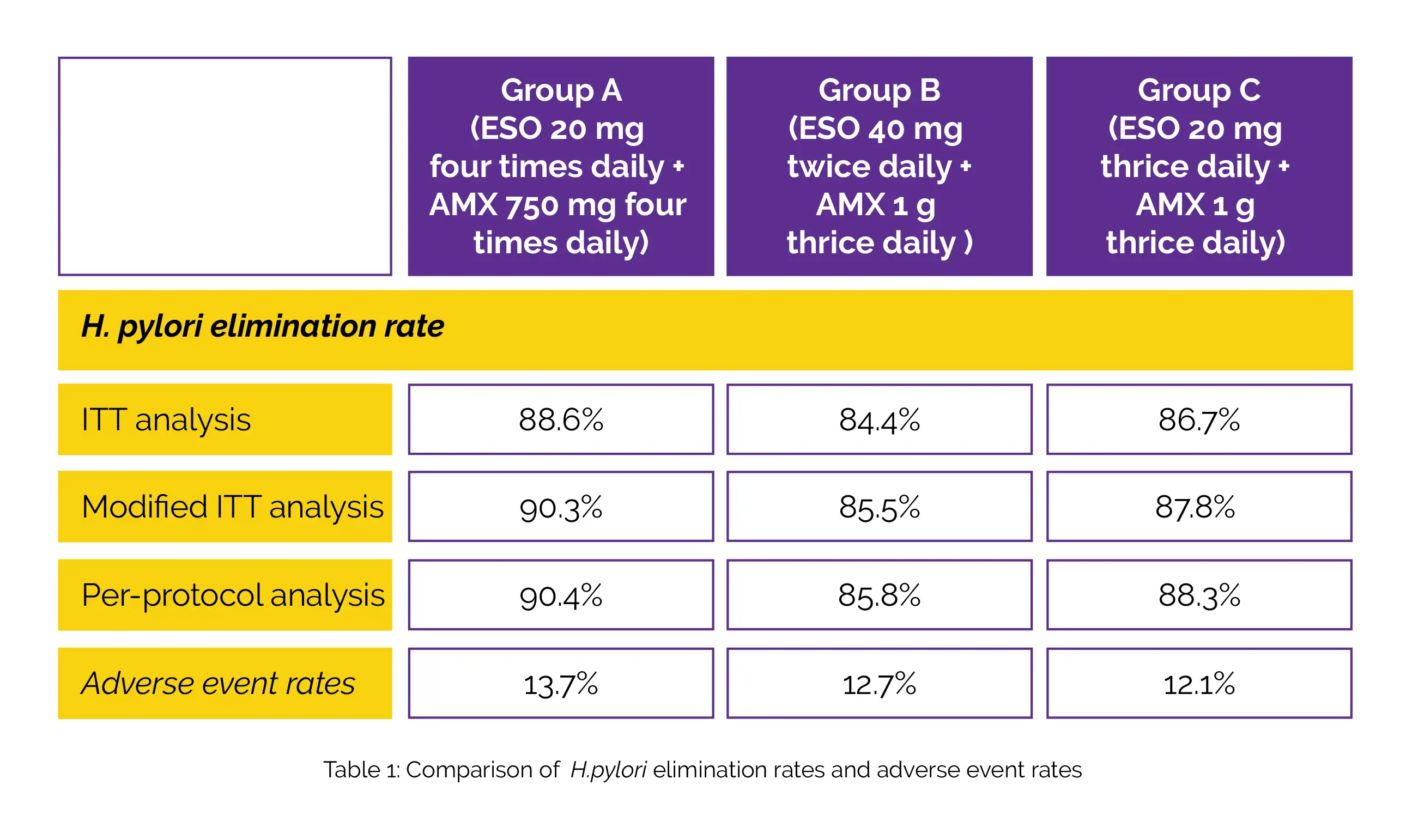 Notably, 945 of 1080 patients that were screened underwent randomization. Table 1 shows adverse event rates in the study groups. According to intention-to-treat (ITT), modified ITT, and per-protocol assessment, the H.pylori elimination rates in groups A, B, and C, are depicted in Table 1: