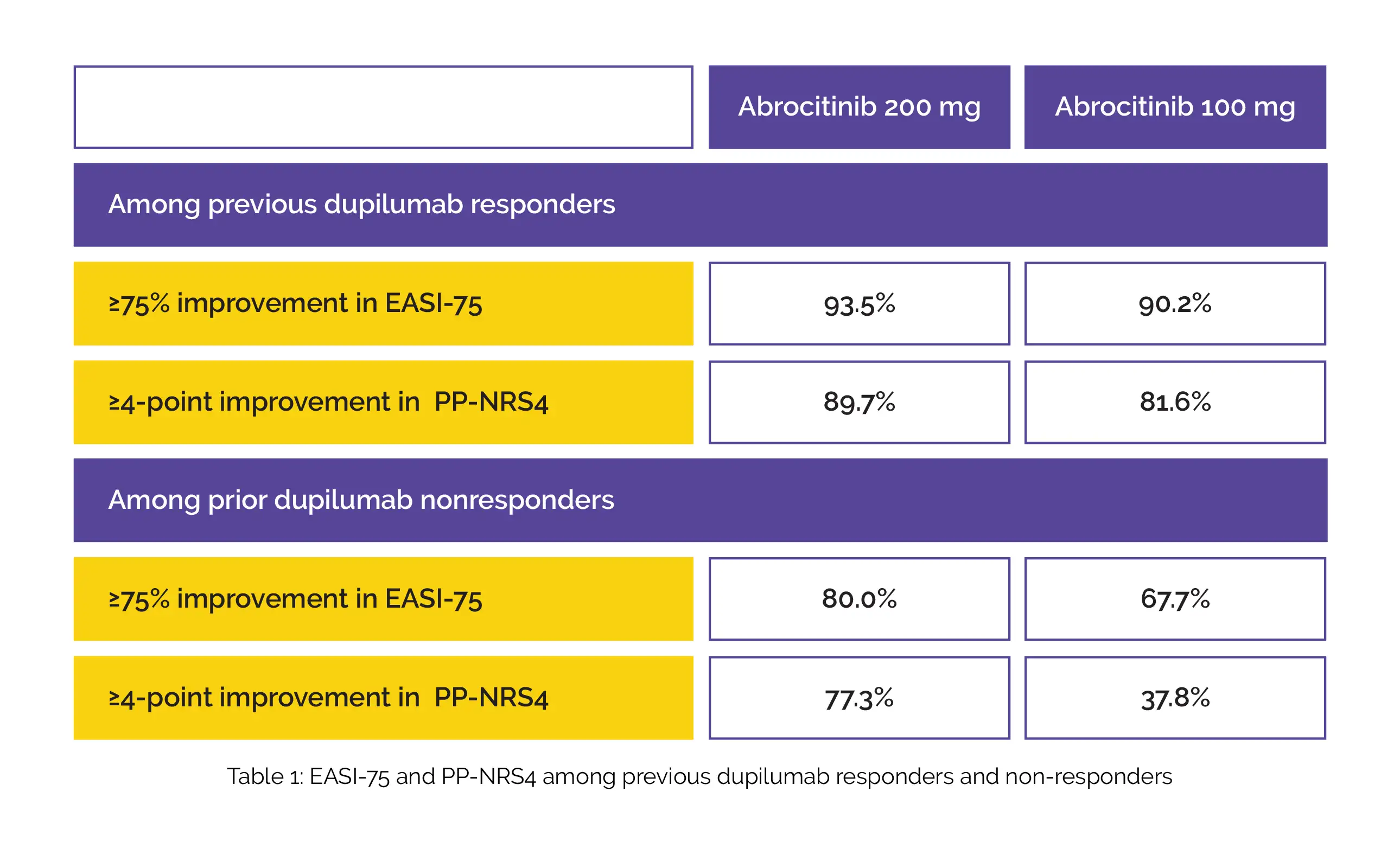 Participants were given 100 mg or 200 mg abrocitinib once-daily in JADE EXTEND (phase III extension) after dupilumab in double-blind, placebo-controlled phase 3 JADE COMPARE. Among previous dupilumab responders and non-responders, ≥75% improvement in Eczema Area and Severity Index (EASI-75) and ≥4-point improvement in Peak Pruritus Numerical Rating Scale (PP-NRS4) was attained in a higher percentage of people who were given 12 weeks of 200 mg abrocitinib when compared to 100 mg abrocitinib, as shown in Table 1: