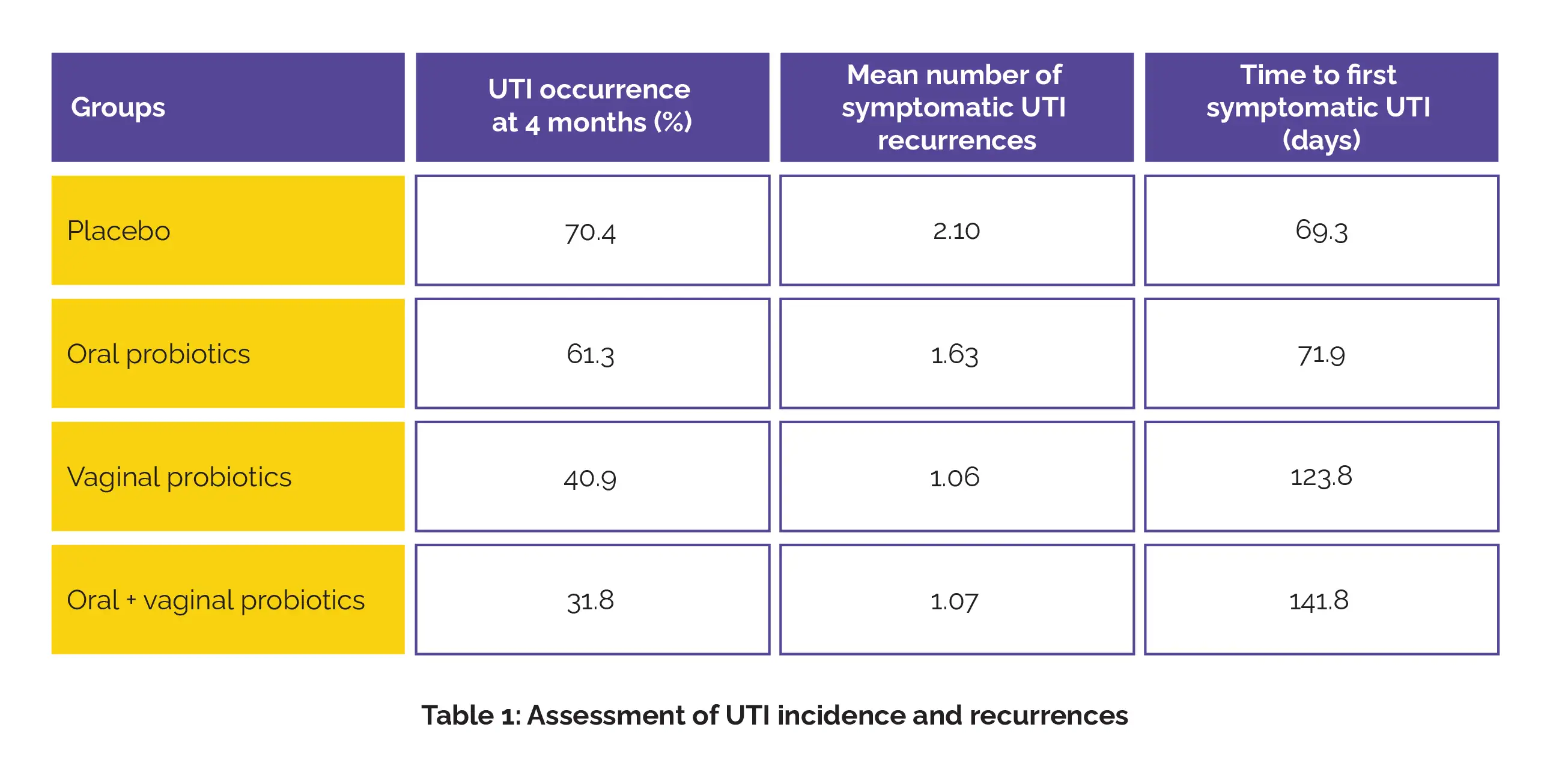 After 4 months, UTI incidence was highest in the placebo and oral-only groups, while participants receiving vaginal probiotics or the combined oral and vaginal regimen experienced notably fewer infections. Similarly, the number of symptomatic UTI recurrences was considerably lower, and the time to the first symptomatic UTI was considerably longer, in the vaginal and combination groups compared with the placebo and oral-only groups (Table 1).