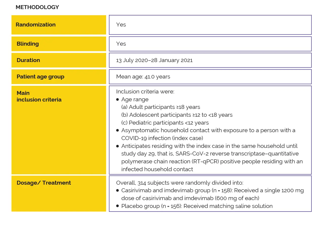 In part A of the study, subcutaneous administration of imdevimab and casirivimab aided in the prevention of asymptomatic and symptomatic coronavirus disease in uninfected people residing with an infected household contact. Part B of the study explored the influence of casirivimab plus imdevimab in people with early asymptomatic infection in the similar household contact setting. Compared to placebo, casirivimab and imdevimab lowered the incidence of symptomatic SARS-CoV-2 infection over 28 days.