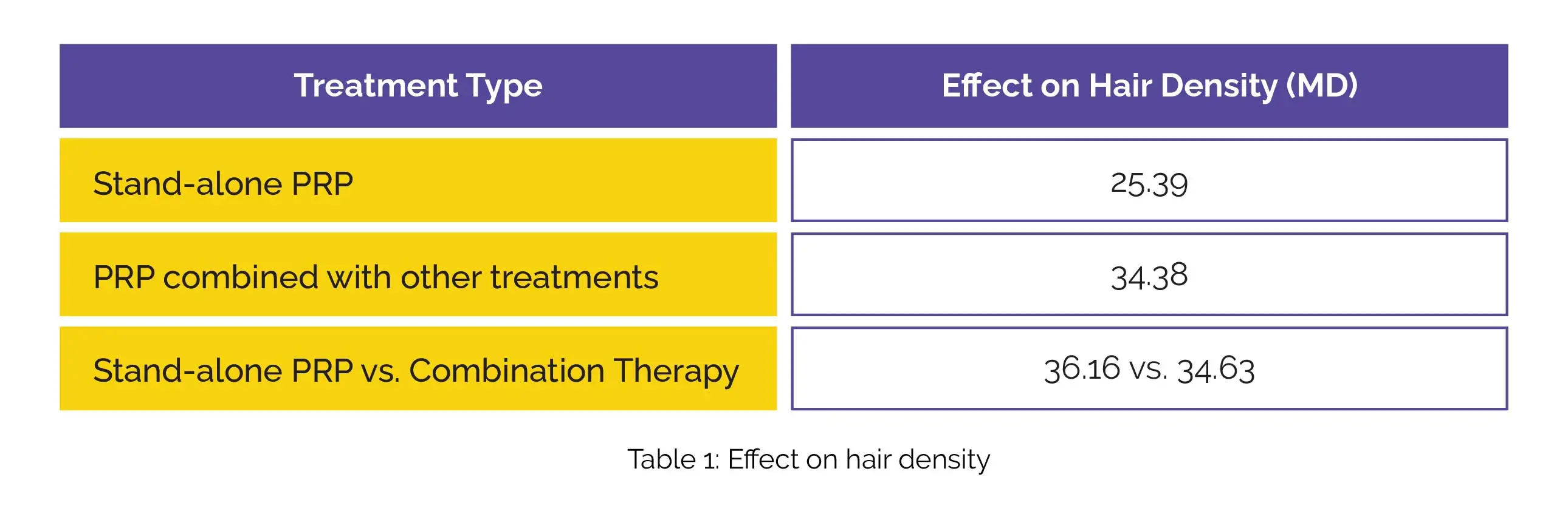 A systematic review and meta-analysis aimed to compare the betterment in hair density, when platelet-rich plasma therapy (PRP) was utilized as an adjunct and when used as a monotherapy.