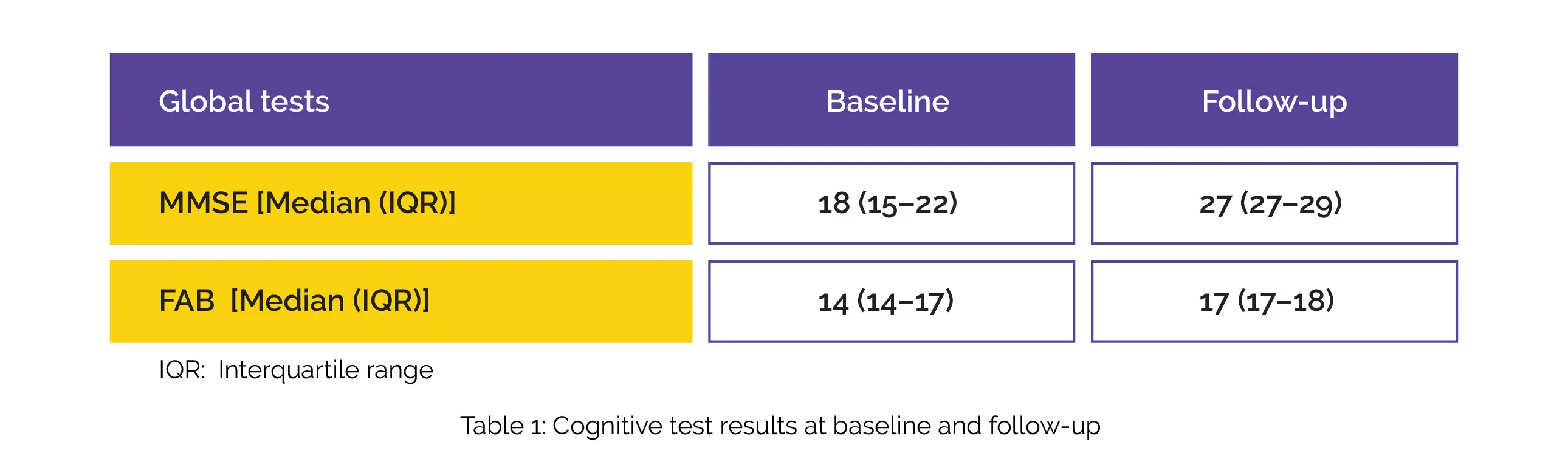 All patients had cognitive decline at baseline. However, at 3 months, improvement was observed on 2 out of 5 global tests following Bonferroni correction for multiple testing, as depicted in Table 1: