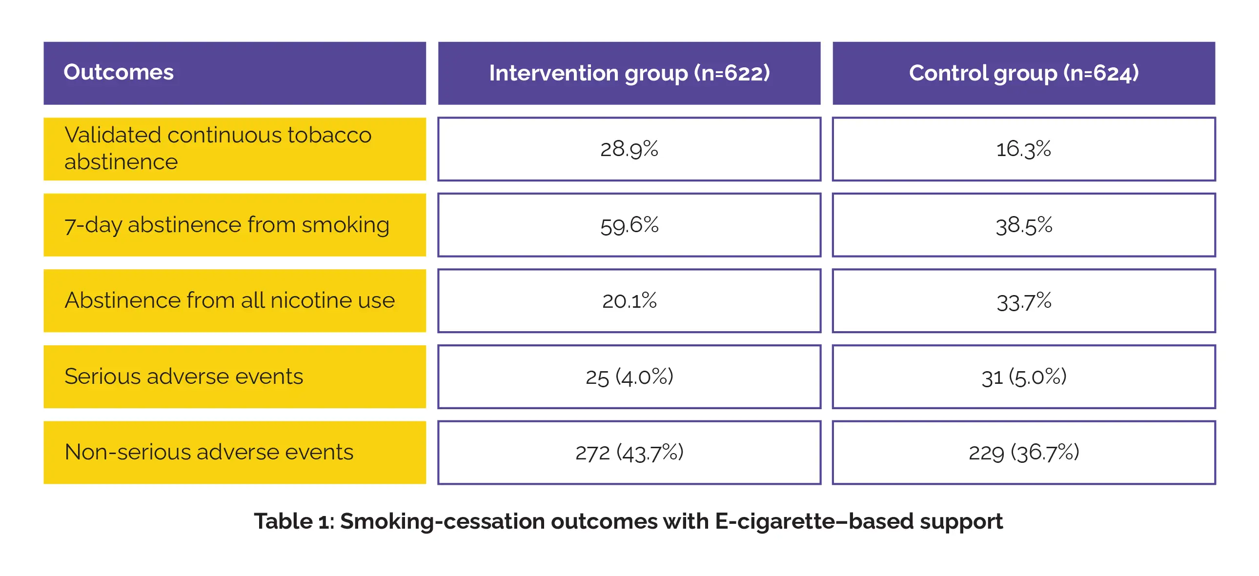 E-cigarettes combined with standard counseling were more effective in achieving tobacco abstinence than counseling alone, without evidence of increased serious adverse events.