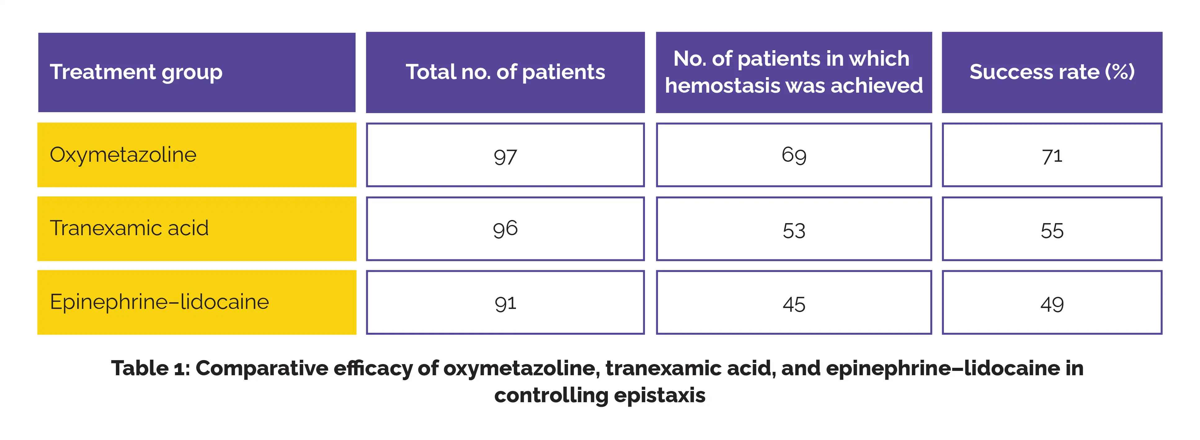 Statistical analysis revealed vital differences in hemostatic success between the treatment groups, with oxymetazoline illustrating the highest efficacy (p = 0.007).
