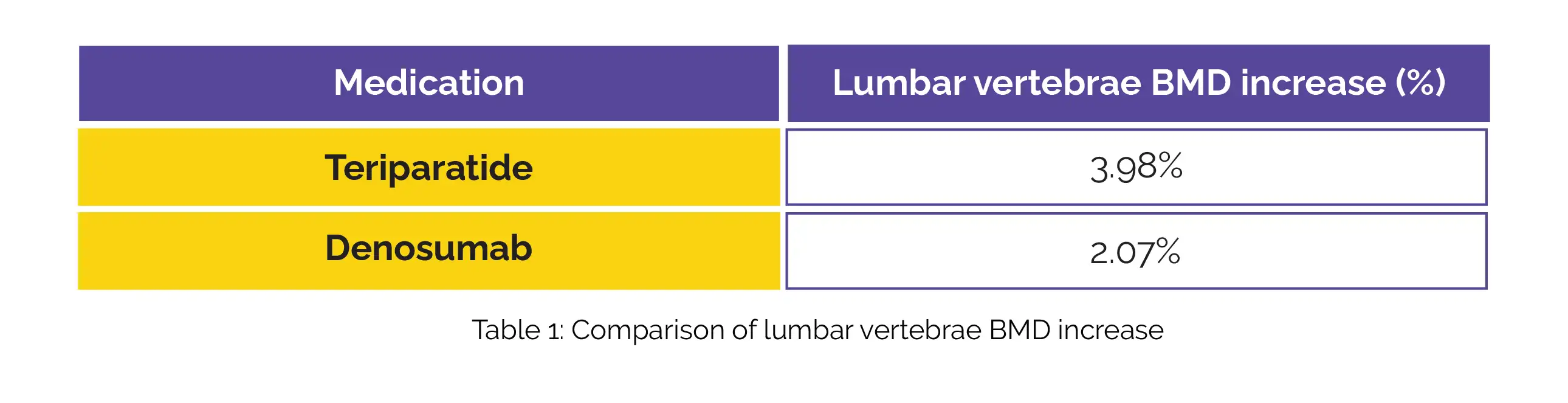 With their comparable or even superior attributes to Bisphosphonates, Teriparatide and Denosumab were promising as primary treatments for osteoporosis. These treatments hold promise as primary options for managing glucocorticoid-induced osteoporosis, particularly in cases where patients have previously encountered limited effectiveness with other anti-osteoporotic medications.