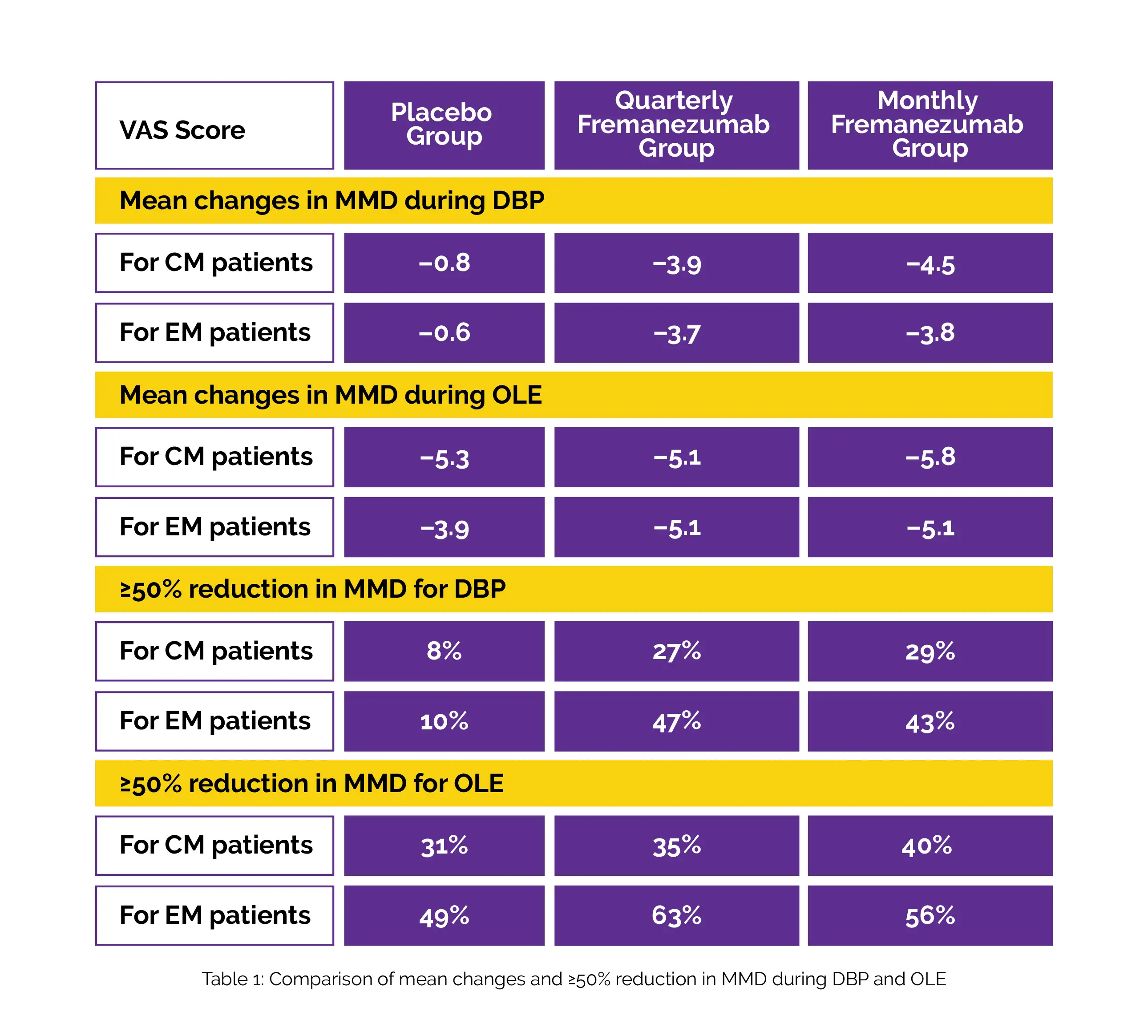 Table 1 illustrates the least squares mean changes in monthly migraine days (MMD) in placebo, quarterly, and monthly Fremanezumab groups for CM patients (n=509) and for EM patients (n=328), mean MMD changes for EM patients (n=313) and for CM patients (n=493) during OLE and DBP. For individuals with CM and EM, the monthly headache days of at least moderate severity decreased during DBP and elevated during OLE. For DBP and OLE, ≥50% reduction in MMD in placebo, quarterly, and monthly Fremanezumab groups for CM and EM individuals was observed.