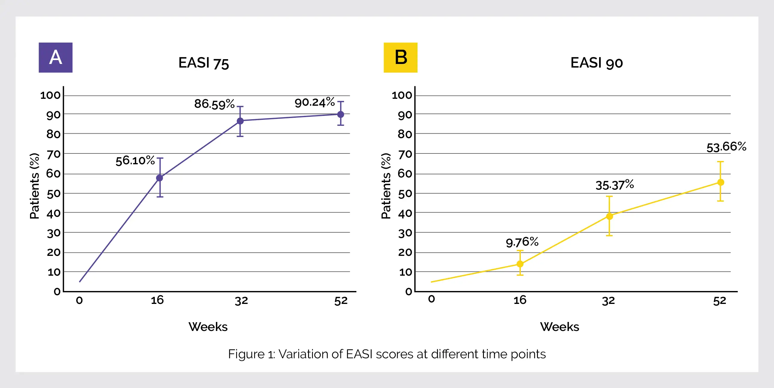 A higher improvement at 52 weeks was noted in efficacy outcomes at 52 weeks than at 16 weeks. The EASI (88.1%), peak pruritus NRS (65.6%), POEM (67.2%), and DLQI (69.0%) scores were reduced as compared to the starting point. The percentage of patients achieving EASI 75 and 90 has been shown in the following Figure 1:
