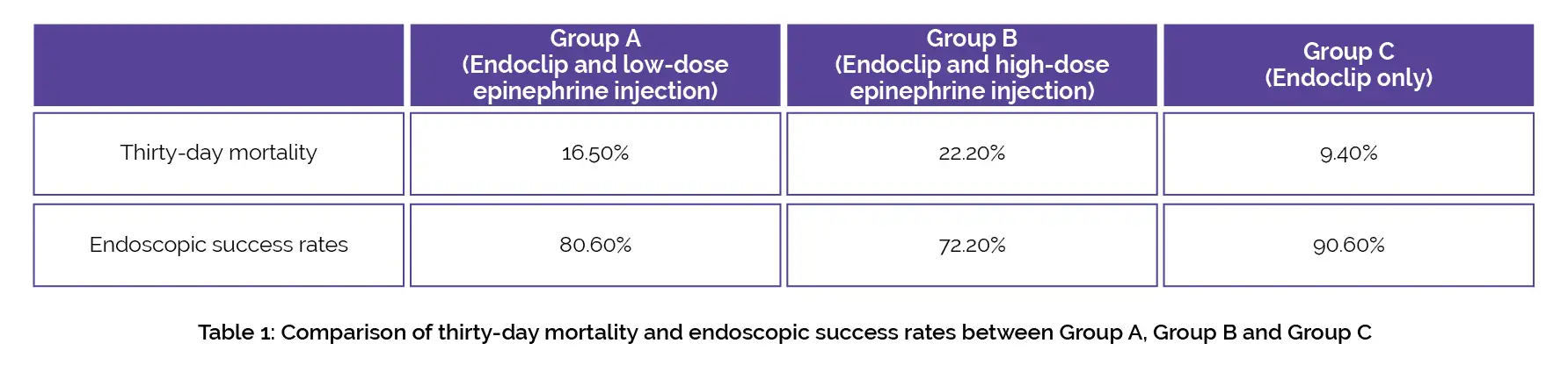 Thirty-day mortality and endoscopic success rates reported in study groups are listed in table 1: