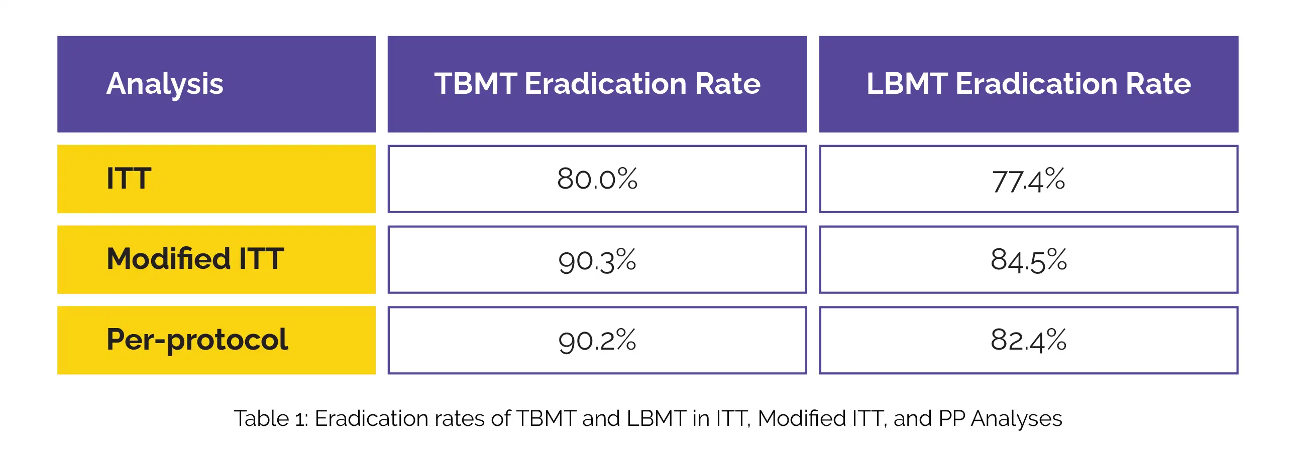 In this randomized, double-blind, active-controlled study, TBMT demonstrated greater rates of elimination than LBMT. Table 1 illustrates the elimination rates of TBMT and LBMT in the per-protocol (PP), corresponding modified ITT, and intention-to-treat (ITT) analyses.