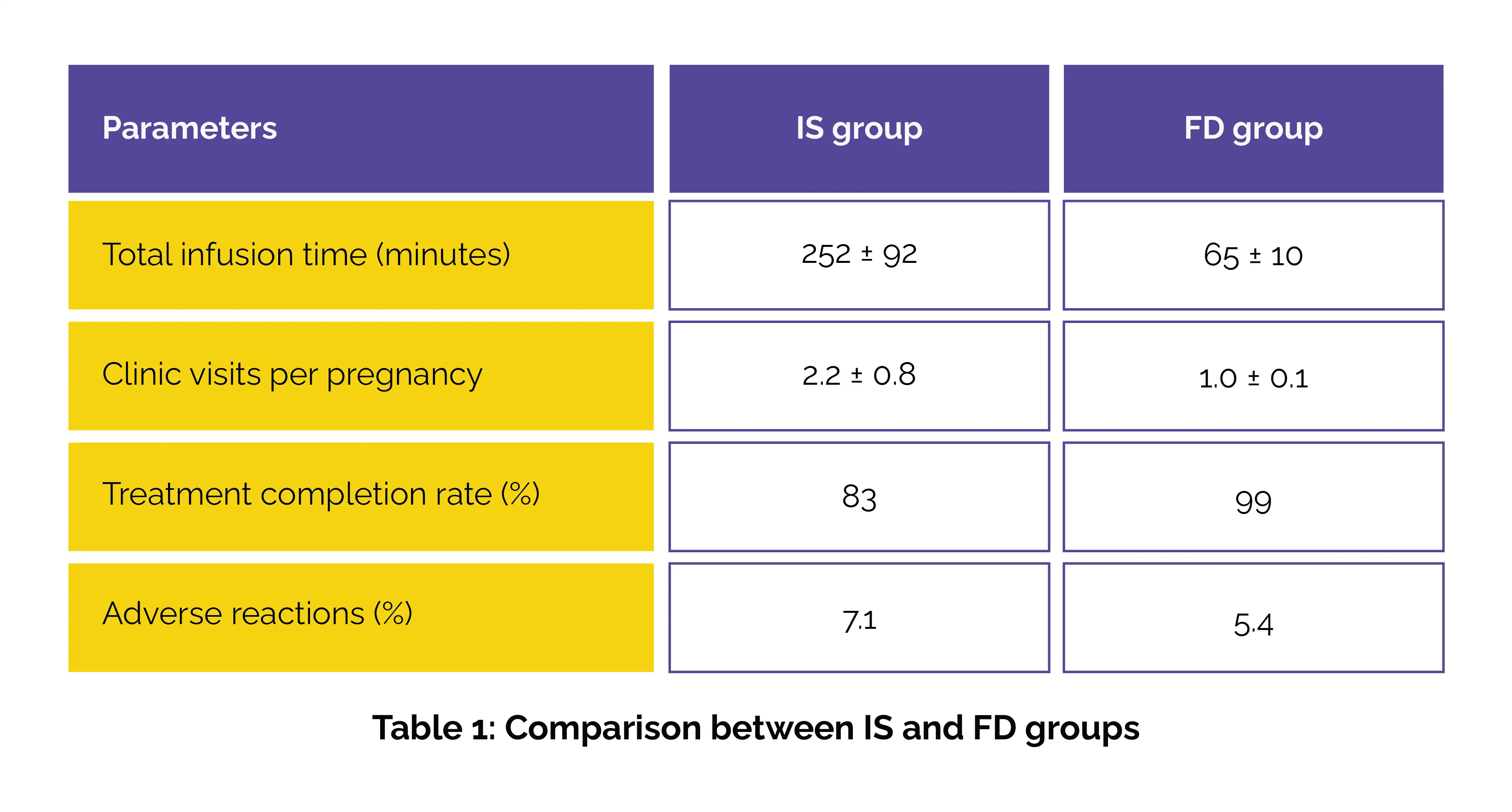 Among 514 patients, 327 received IS and 187 received FD. Following the FD introduction, the mean number of patients treated per month escalated from 20.1 ± 4.5 in Period 1 to 20.9 ± 4.4 in Period 2, and to 30.7 ± 6.3 in Period 3. Compared with IS, FD was linked with substantially shorter total infusion times, fewer clinic visits per pregnancy, and higher treatment completion rates, without an increase in adverse reactions (Table 1).