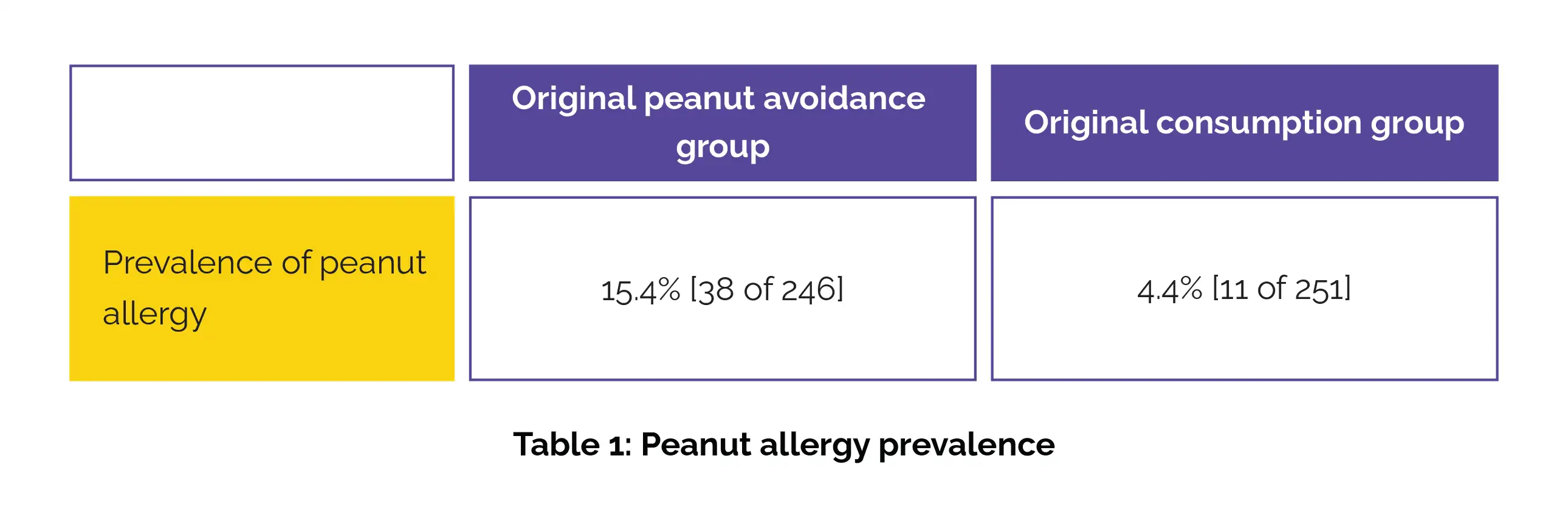 Of the initial 640 volunteers, 508 (79.4%) were enrolled, with 497 offering complete primary outcome data. At 144 months, the prevalence of peanut allergy remained quite higher in the original peanut avoidance group as opposed to the original consumption group (Table 1).