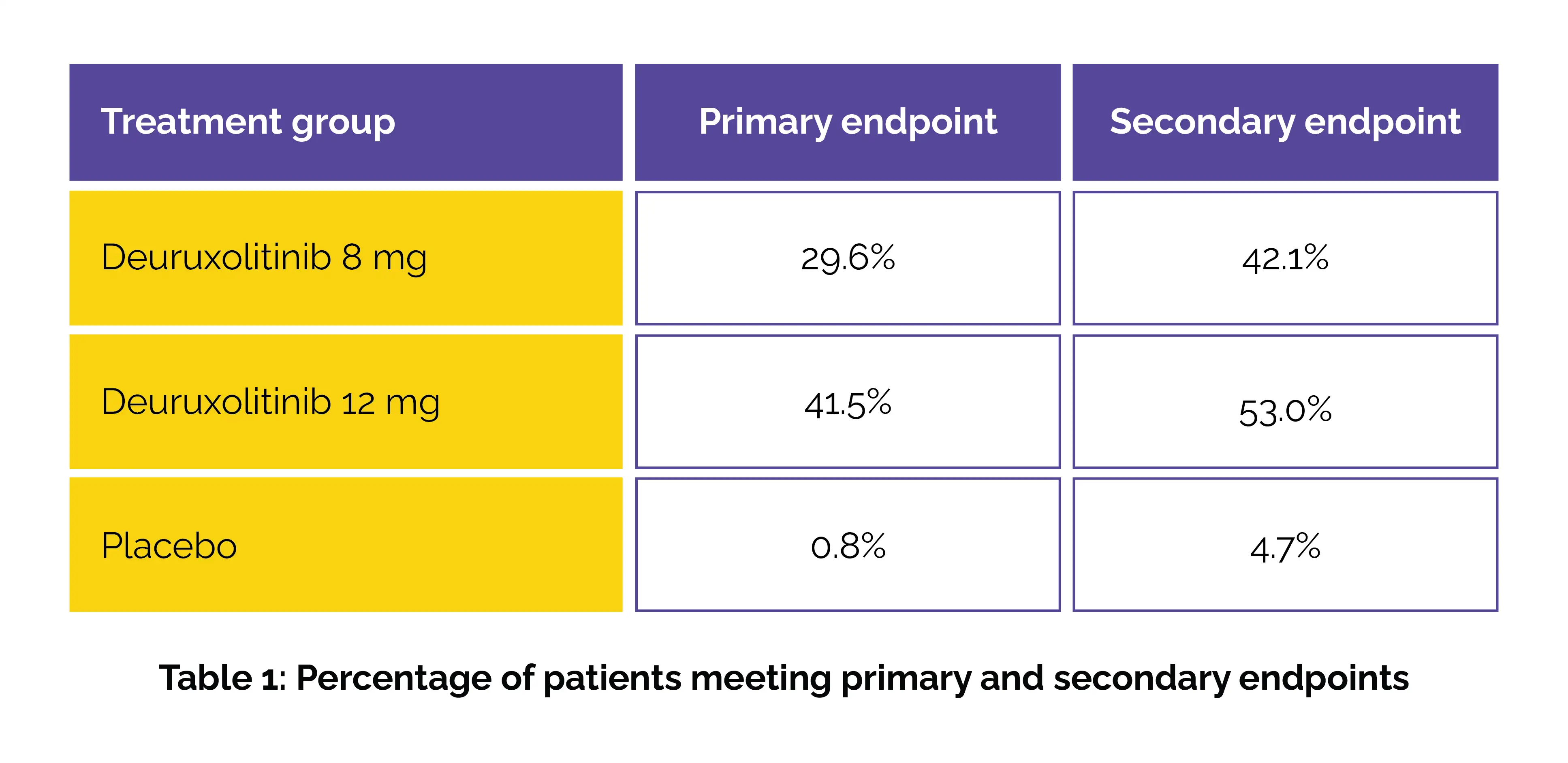 When compared to placebo, significantly more patients on deuruxolitinib reached the primary endpoint. Both deuruxolitinib doses also showed marked improvements across all secondary outcomes, including patient-reported hair satisfaction (Table 1).