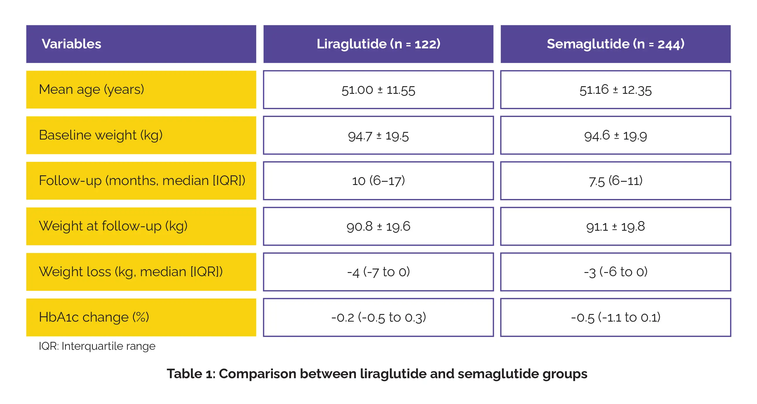 A total of 366 patients were analyzed, with 122 receiving liraglutide and 244 receiving semaglutide. Baseline traits were similar between the groups, including mean age and mean body weight. The median follow-up was longer in the liraglutide arm as opposed to the semaglutide arm. At follow-up, both groups attained comparable median weight change and reduction in mean body weight. However, HbA1c reduction was more pronounced with semaglutide than with liraglutide, as shown in Table 1: