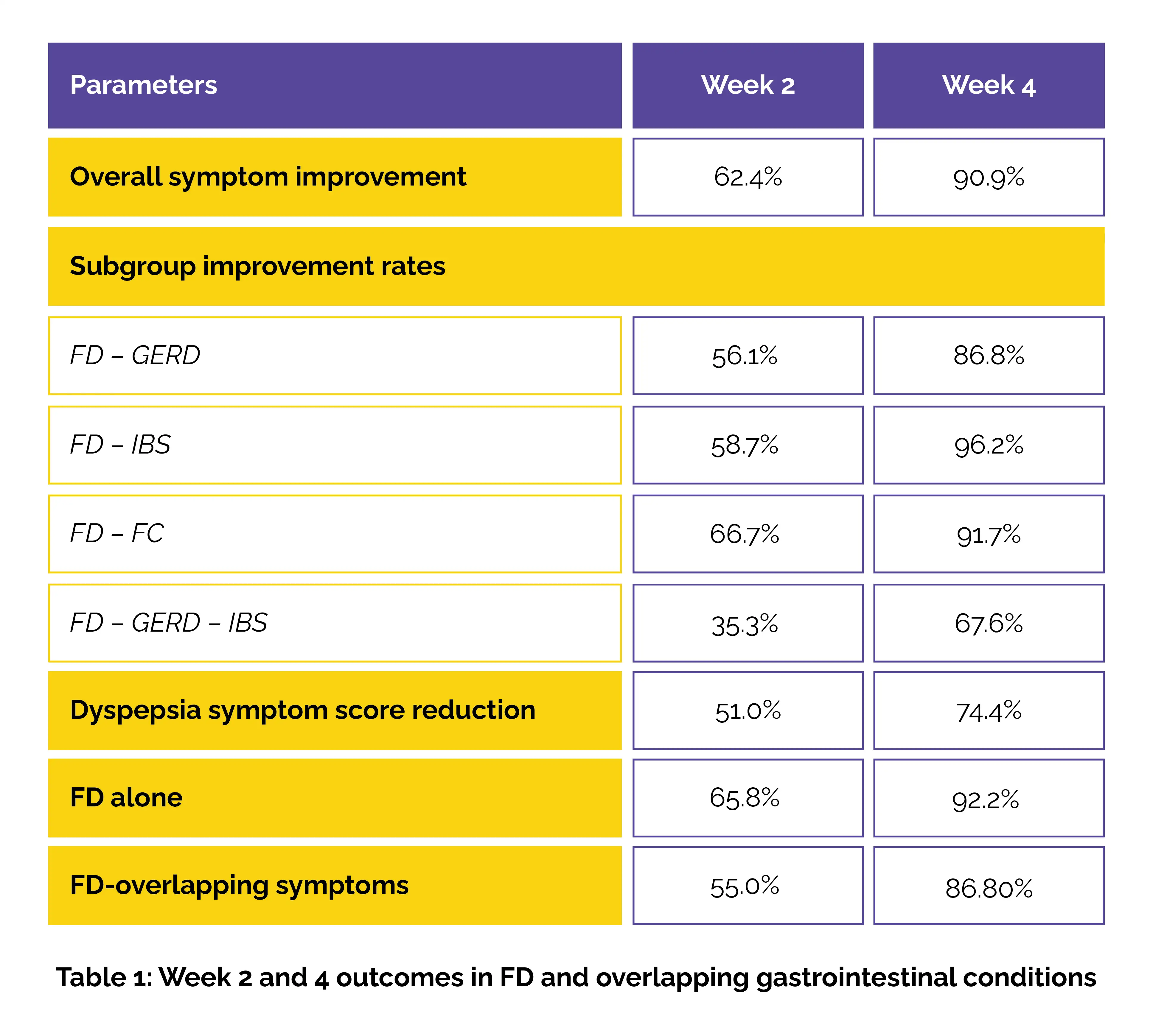 Patients with FD showed significant symptom improvement over time. By week 2, most patients experienced noticeable relief, which further increased by week 4. Those with only FD improved more rapidly and to a greater extent than patients with overlapping conditions such as GERD, IBS, or FC. Overall, symptom severity decreased substantially from week 2 to week 4, demonstrating the effectiveness of cinitapride treatment (Table 1).