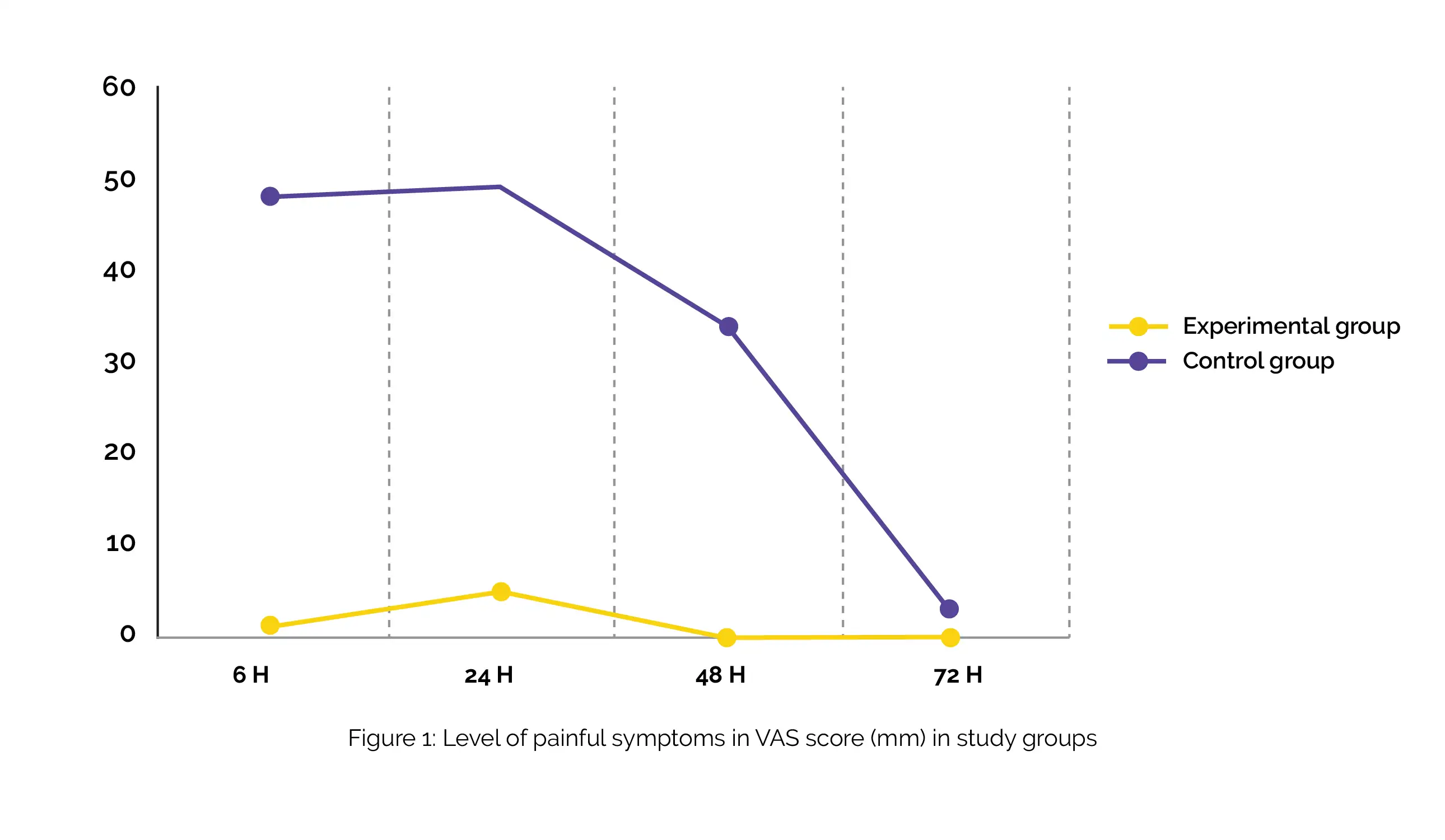 Utilization of visual analogue scale (VAS) was done to quantify severity of pain at 6, 24, 48, and 72 h. By answering a questionnaire, perception of pain (initiation, peak, decrease, and absence) was assessed. A nonparametric Mann-Whitney analysis was carried out to assess pain perception and intensity between groups.