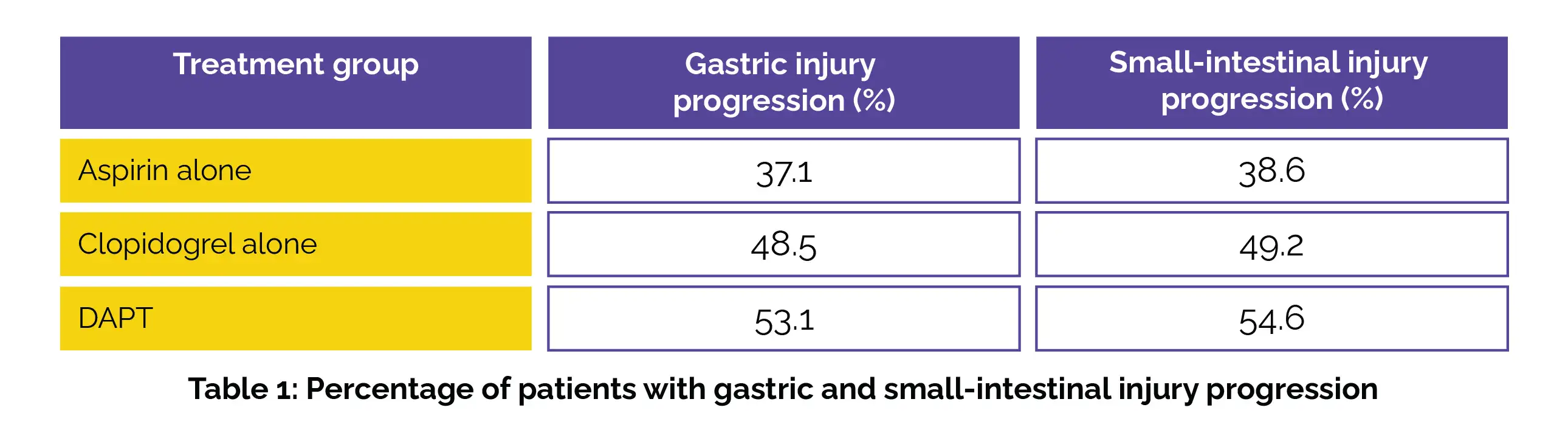 In this secondary analysis, 394 patients were included in the mITT cohort, with a mean (standard deviation [SD]) age of 56.9 (8.7) years, predominantly male (296 [75.1%]). Notably, Aspirin users had a reduced rate of gastric injury advancement compared to DAPT users (risk ratio [RR], 0.70 [95% CI, 0.49-0.99]). Similar to gastric injury, Aspirin users demonstrated a lower rate of small-intestinal injury progression compared to DAPT users (RR, 0.71 [95% CI, 0.50-0.99]), as shown in Table 1: