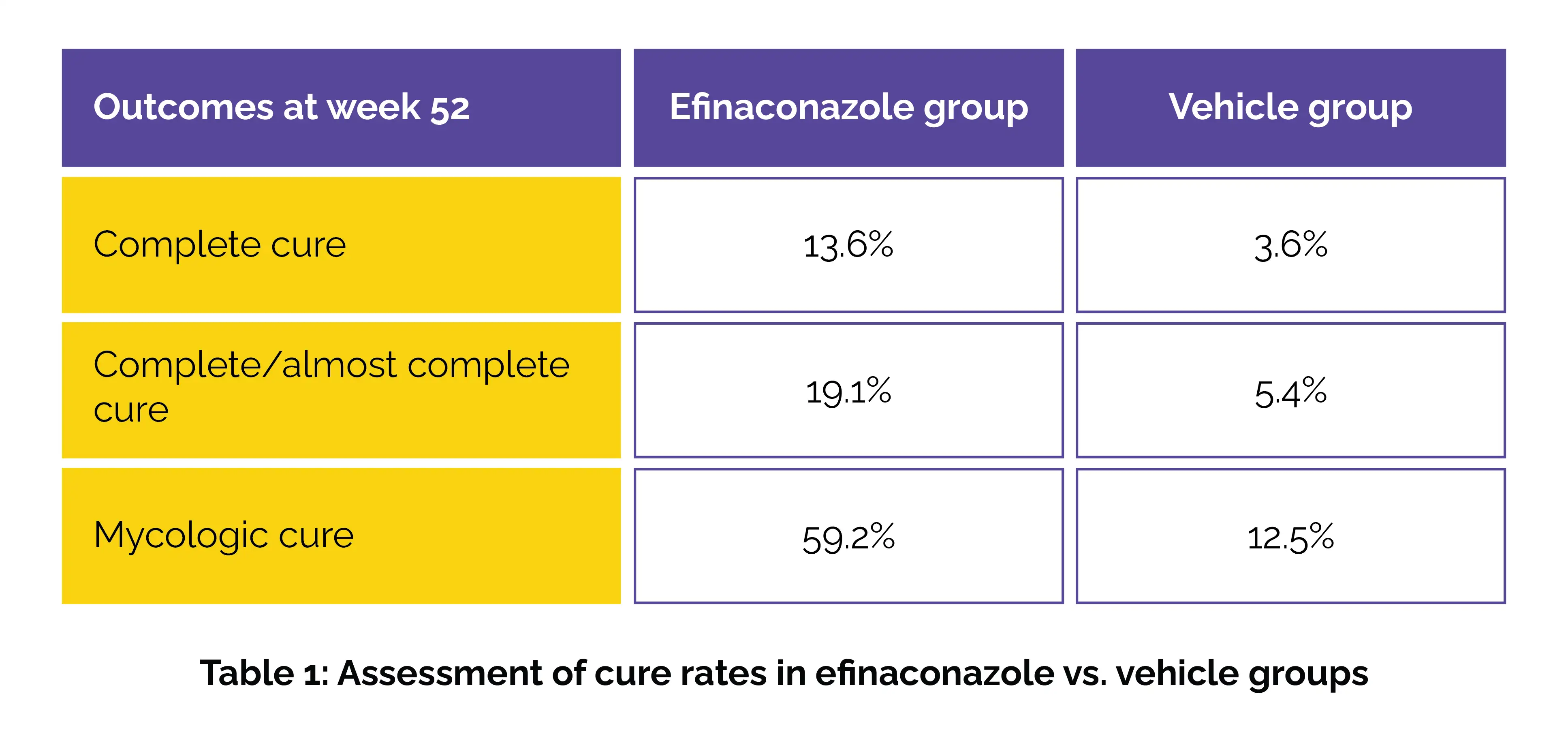 At week 52, volunteers (aged 65–71 years) treated with efinaconazole exhibited a significantly higher complete cure rate when compared to those receiving vehicle. The rate of mycologic cure and complete or almost complete cure (≤5% nail involvement and mycologic cure) was also markedly higher with efinaconazole (Table 1).