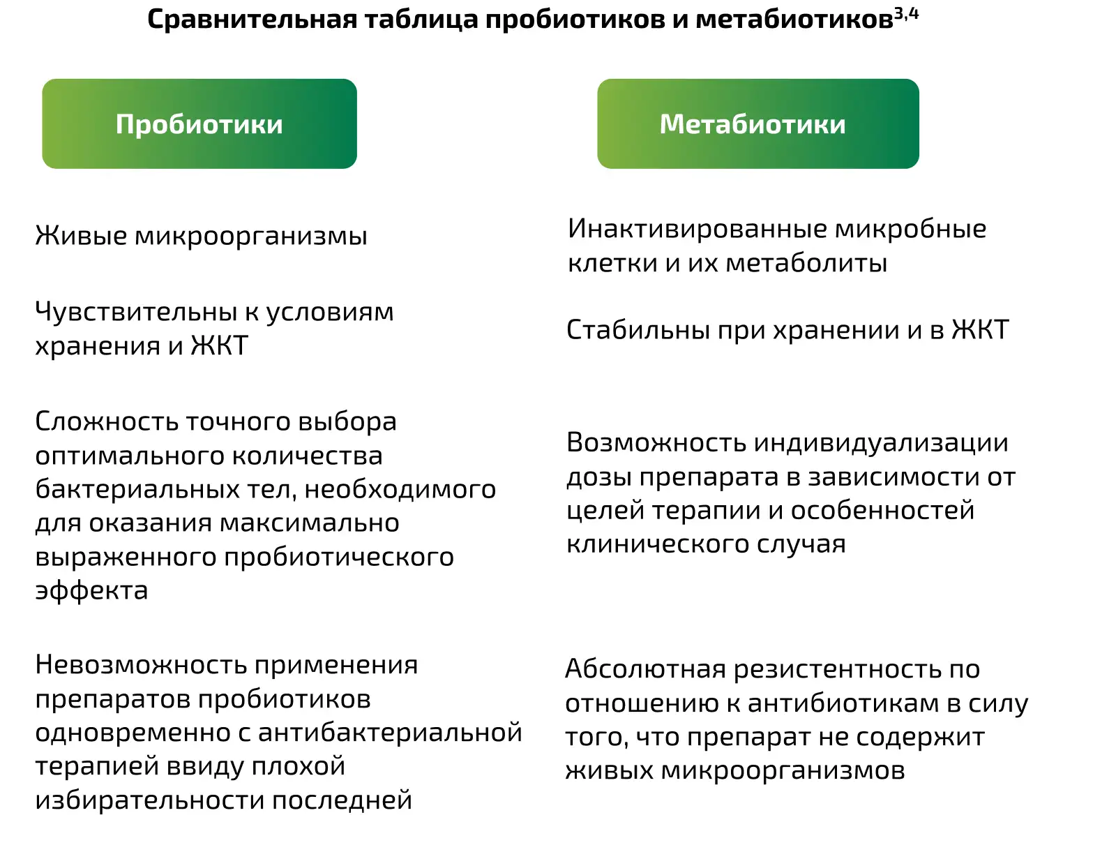 Принципиальное отличие в том, что метабиотики не содержат живых микроорганизмов, в отличие от классических пробиотиков. Кроме того, метабиотики включают как структурные компоненты, так и метаболиты и сигнальные молекулы.