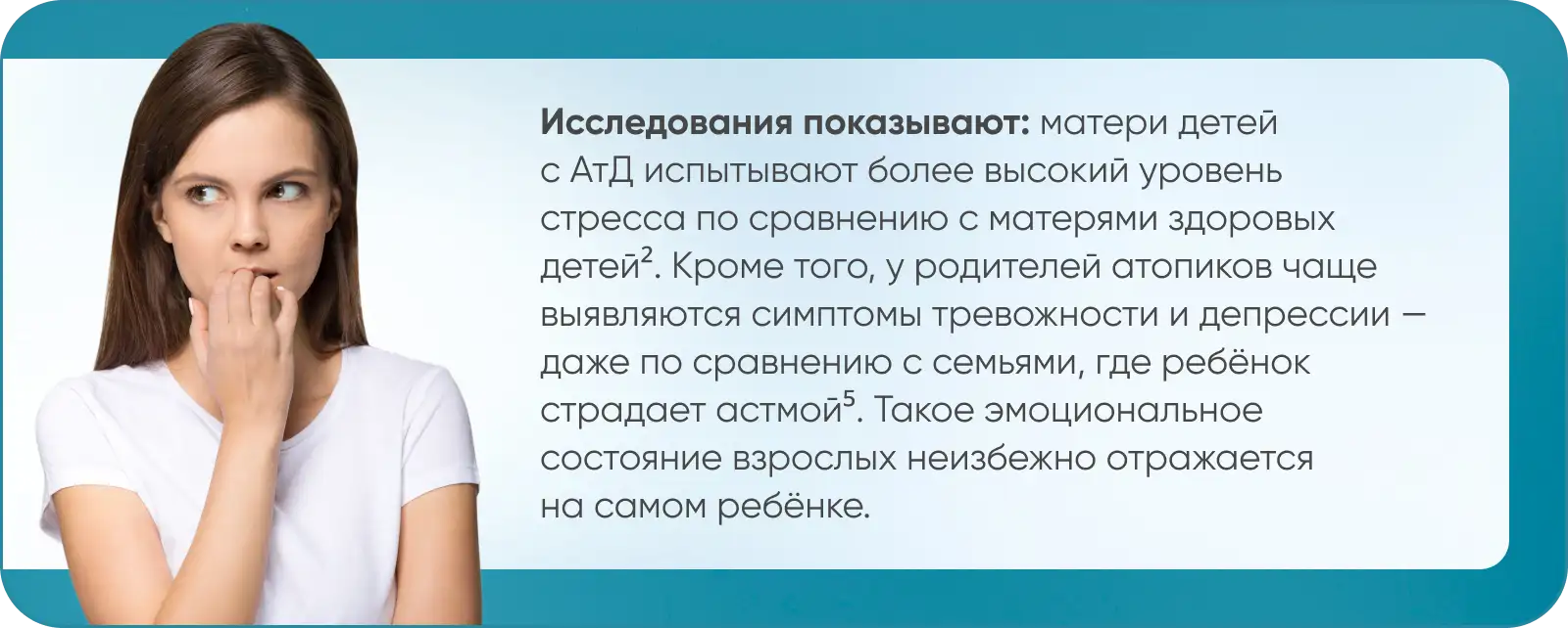 Атопический дерматит (АтД) у ребенка существенно влияет на качество жизни не только пациента, но и его родителей [1,2]. Нарушения сна, постоянный зуд, необходимость в ежедневном уходе, ограничения в питании становятся источником нарастающей тревоги для пап и мам [3,4]. Как помочь?