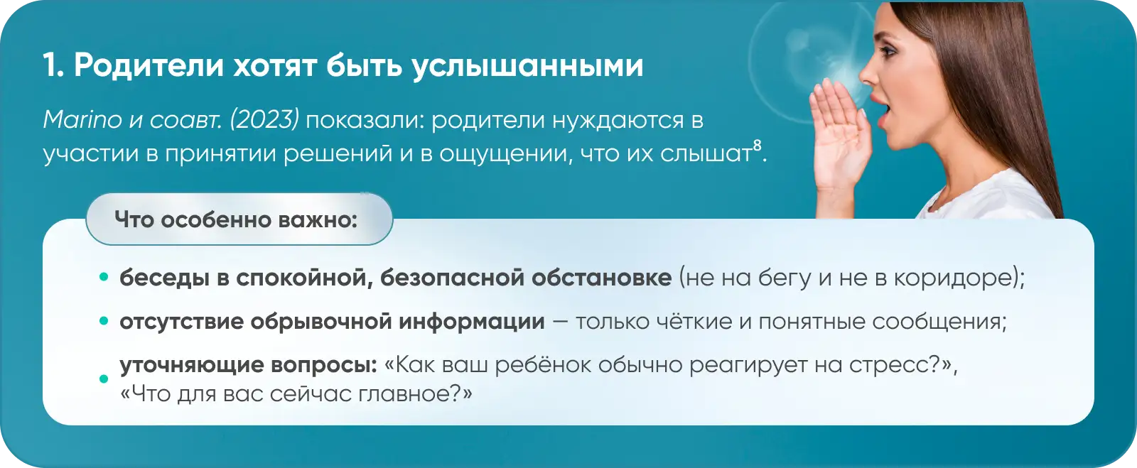 8. Marino L.V. et al. The development of a communication tool to aid parent-centered communication between parents and healthcare professionals: A quality improvement project //Healthcare. – MDPI, 2023. – Т. 11. – №. 20. – С. 2706.