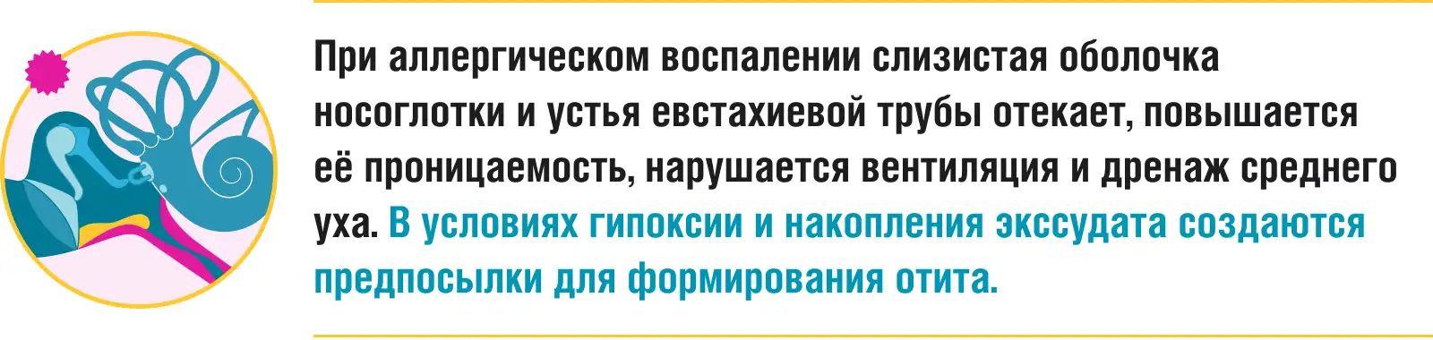 Кроме того, доказано, что в выпотах из среднего уха у пациентов с аллергическим ринитом (АР) выявляются повышение уровня иммуноглобулина E (IgE) и Th2-зависимых цитокинов — интерлейкинов 4 и 5 (ИЛ-4, ИЛ-5)2. Эти маркеры подтверждают гипотезу о том, что аллергическое воспаление играет значимую роль в патогенезе отита, поддерживая воспаление слизистой [2].