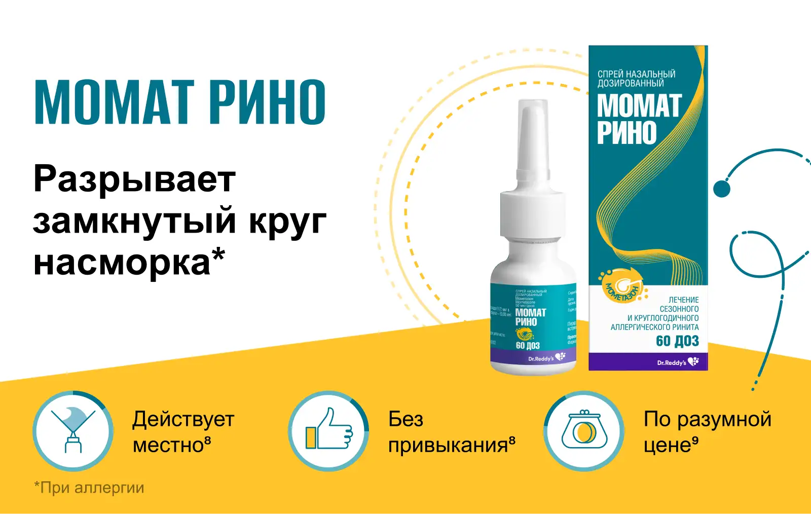 7. Общая характеристика лекарственного препарата Момат Рино, спрей назальный дозированный 50 мкг/1 доза: фл. 60 или 120 доз с дозирующим устройством. Рег. №: ЛП-(001710)-(РГ-RU) от 23.01.23.