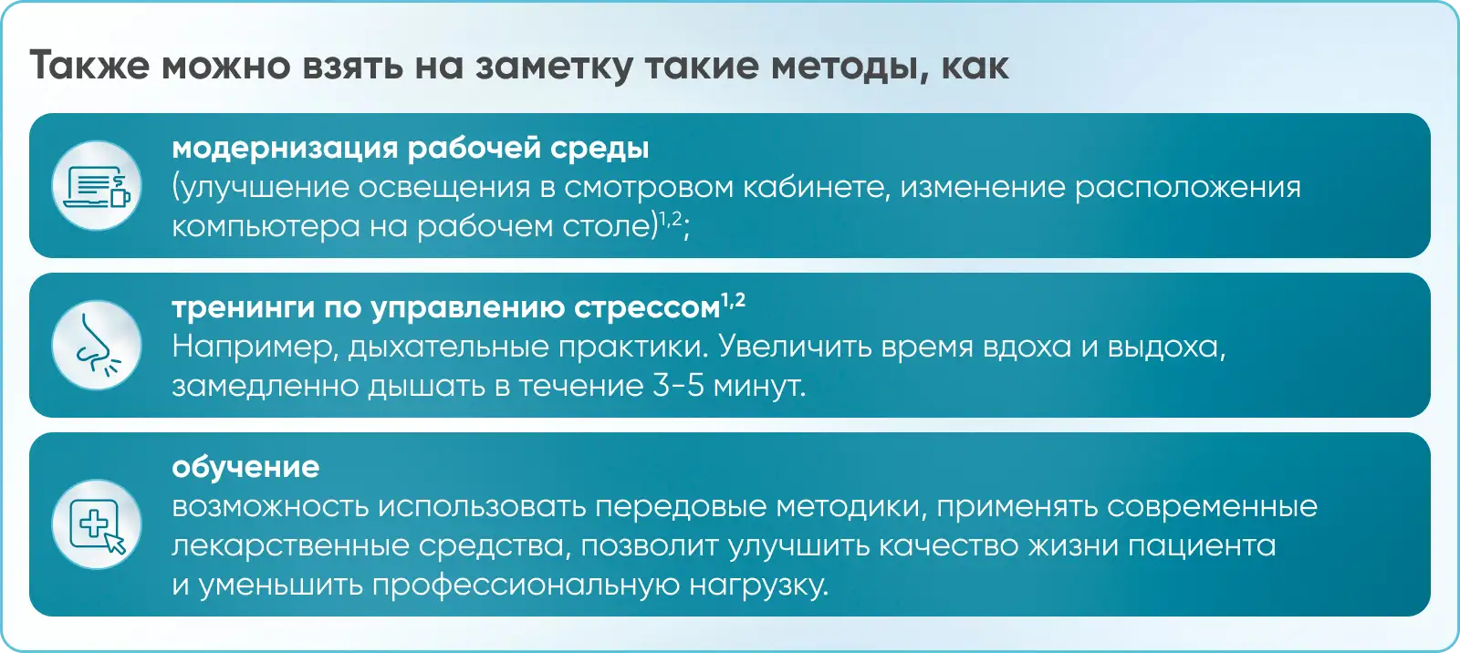 Важно своевременно восстановить нарушенный баланс между профессиональной нагрузкой и личной жизнью. Оптимальной тактикой может стать обсуждение высокого уровня нагрузки с руководителем, уточнение возможности делегирования обязанностей [1,2].