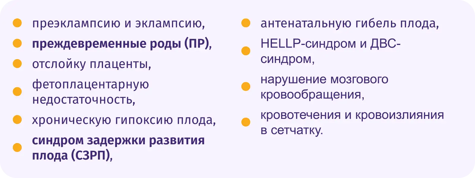 АГ (артериальная гипертензия) у беременных может вызвать множество осложнений как для матери, так и для плода, включая⁴: