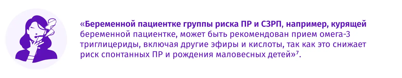 Безусловно, ни один из препаратов, используемых в настоящее время для лечения АГ во время беременности, нельзя считать абсолютно безопасным, особенно на ранней стадии беременности во время эмбриогенеза. Однако при правильном ведении беременности многие из перечисленном осложнений можно предотвратить¹. И одно из возможных комплексных решений — омега-3 жирные кислоты. Дефицит омега-3 может повысить риск развития гипертензии у беременных, а значит, их употребление, соответственно, может этот риск снизить⁶.